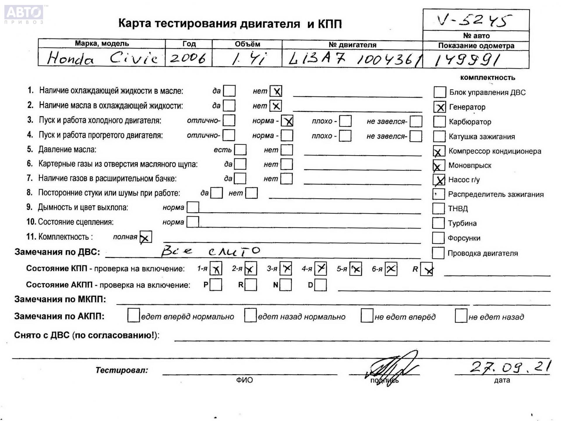 | Марка / Модель / Год: | Honda Civic (2006-2011) 2006 |