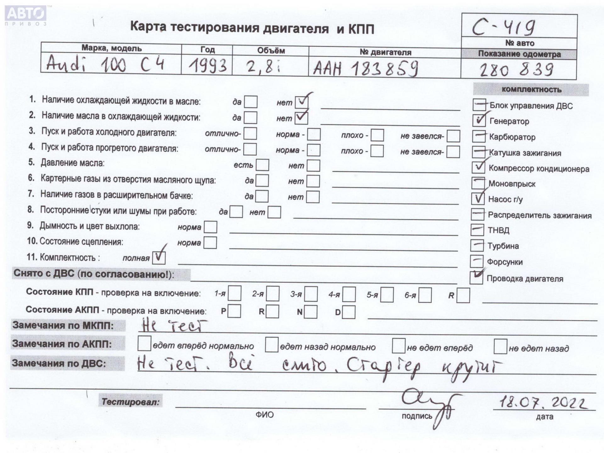 | Марка / Модель / Год: | Audi 100 C4 (1991-1994) 1993 |