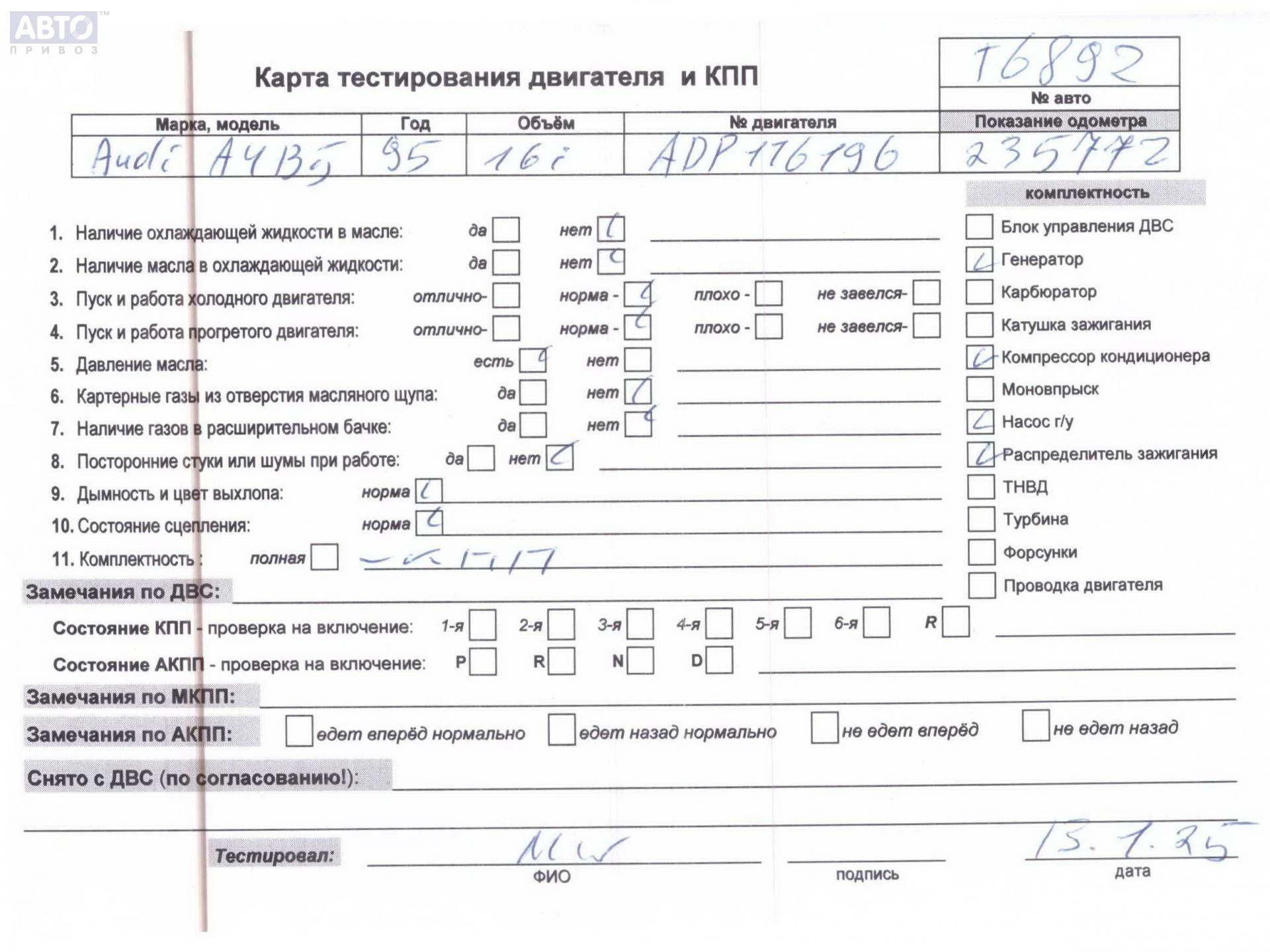 | Автомобиль / VIN: | T6892 WAUZZZ8DZTA301269 |