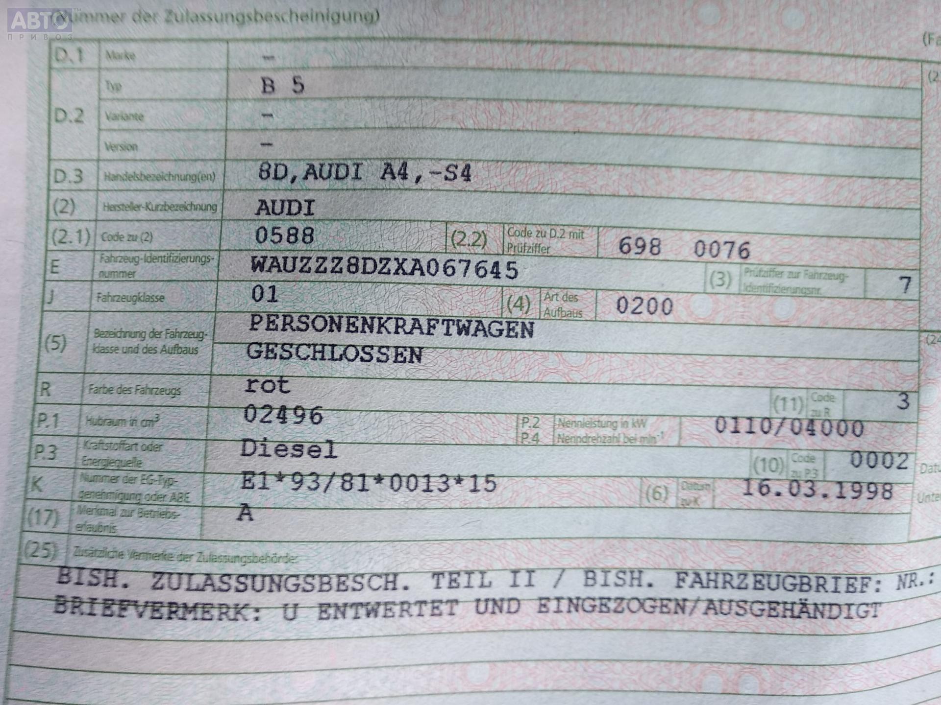 | Марка / Модель / Год: | Audi A4 B5 (1994-2001) 1998 |