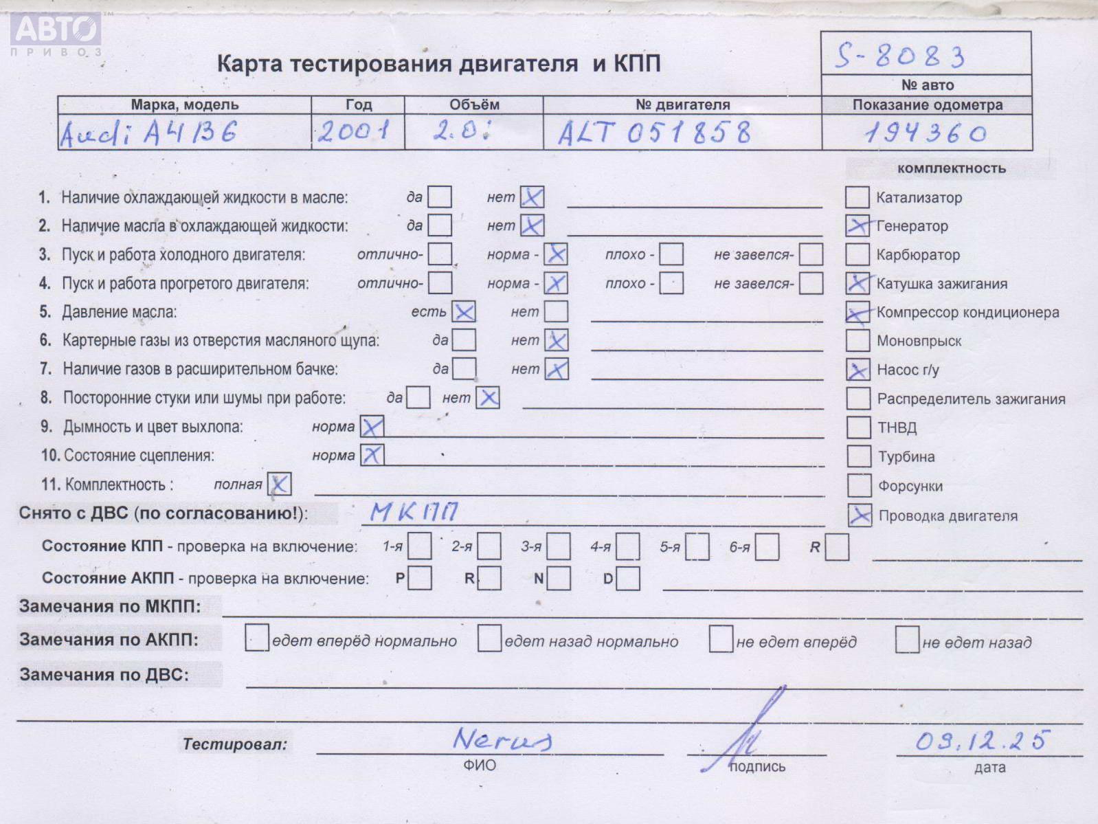 | Автомобиль / VIN: | S8083 WAUZZZ8E62A074163 |