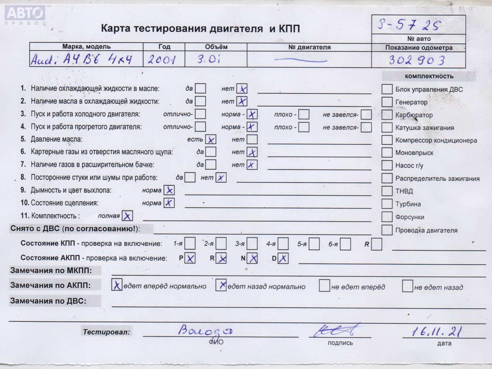 | Марка / Модель / Год: | Audi A4 B6 (2001-2004) 2001 |