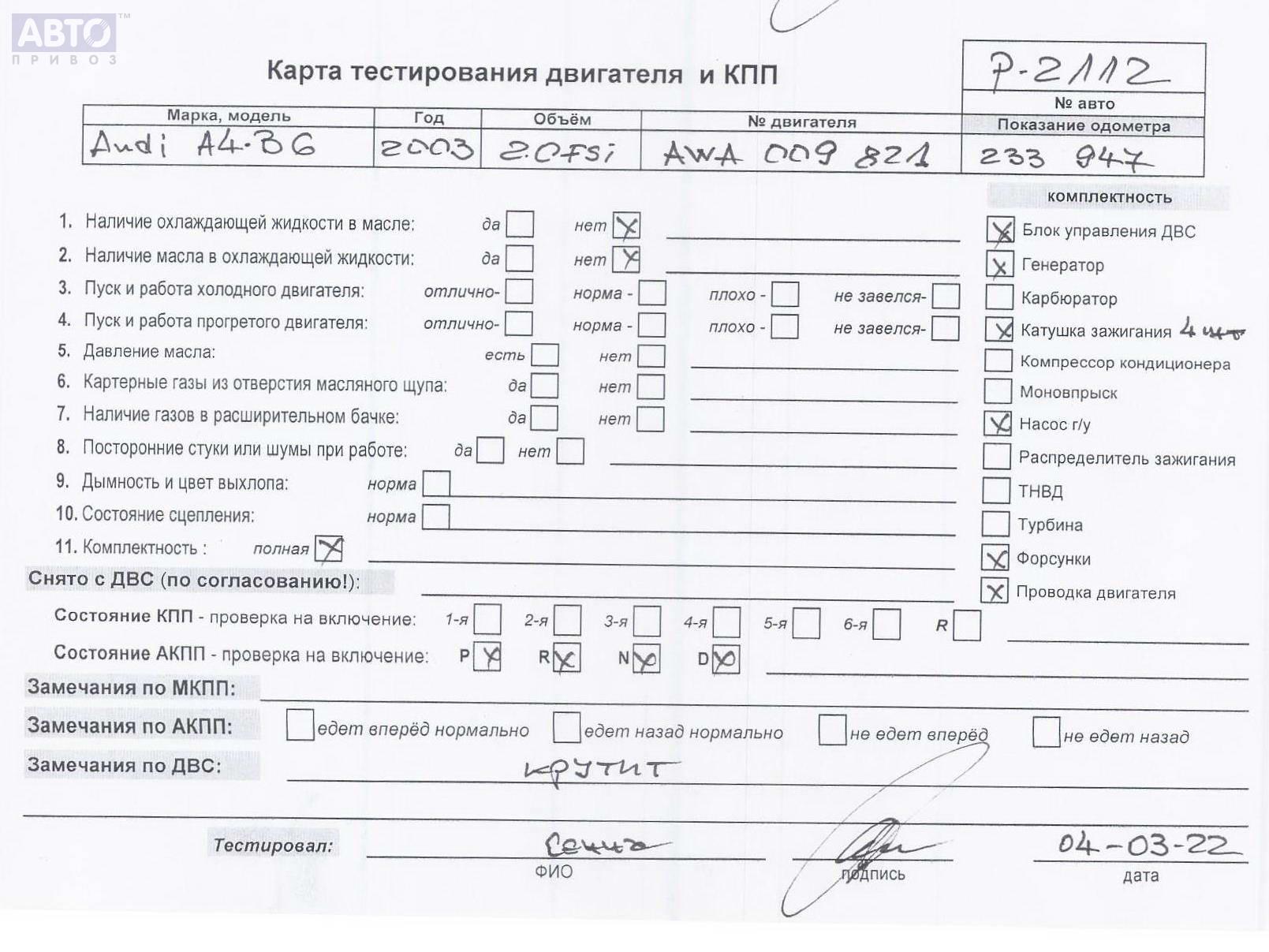 | Автомобиль / VIN: | P2112 WAUZZZ8E34A053029 |