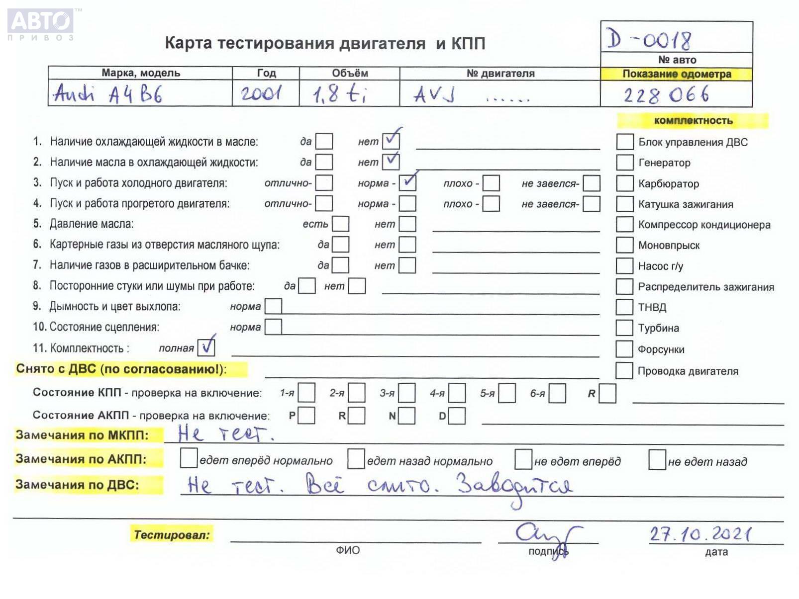 | Марка / Модель / Год: | Audi A4 B6 (2001-2004) 2001 |