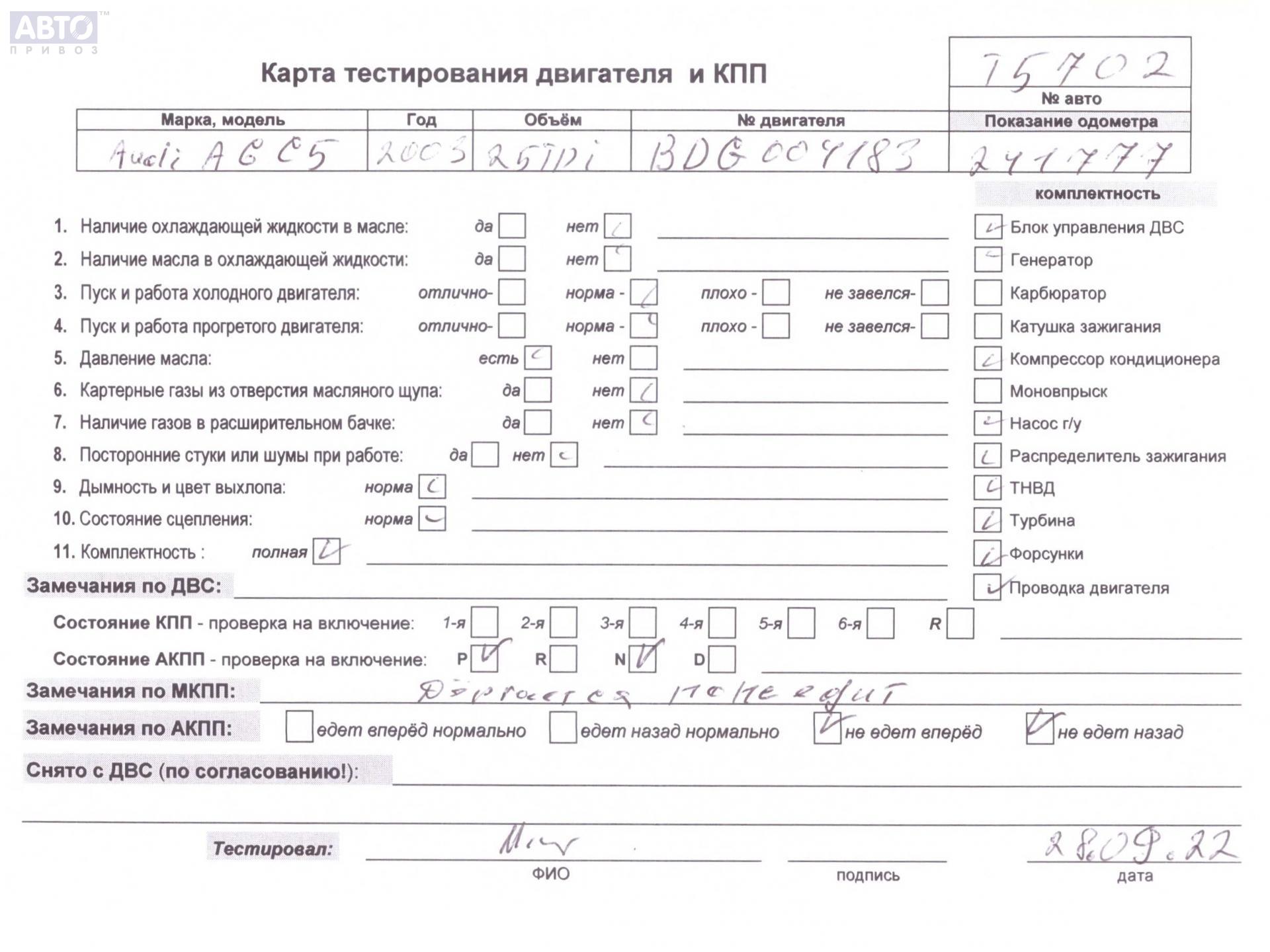 | Марка / Модель / Год: | Audi A6 C5 (1997-2005) 2003 |