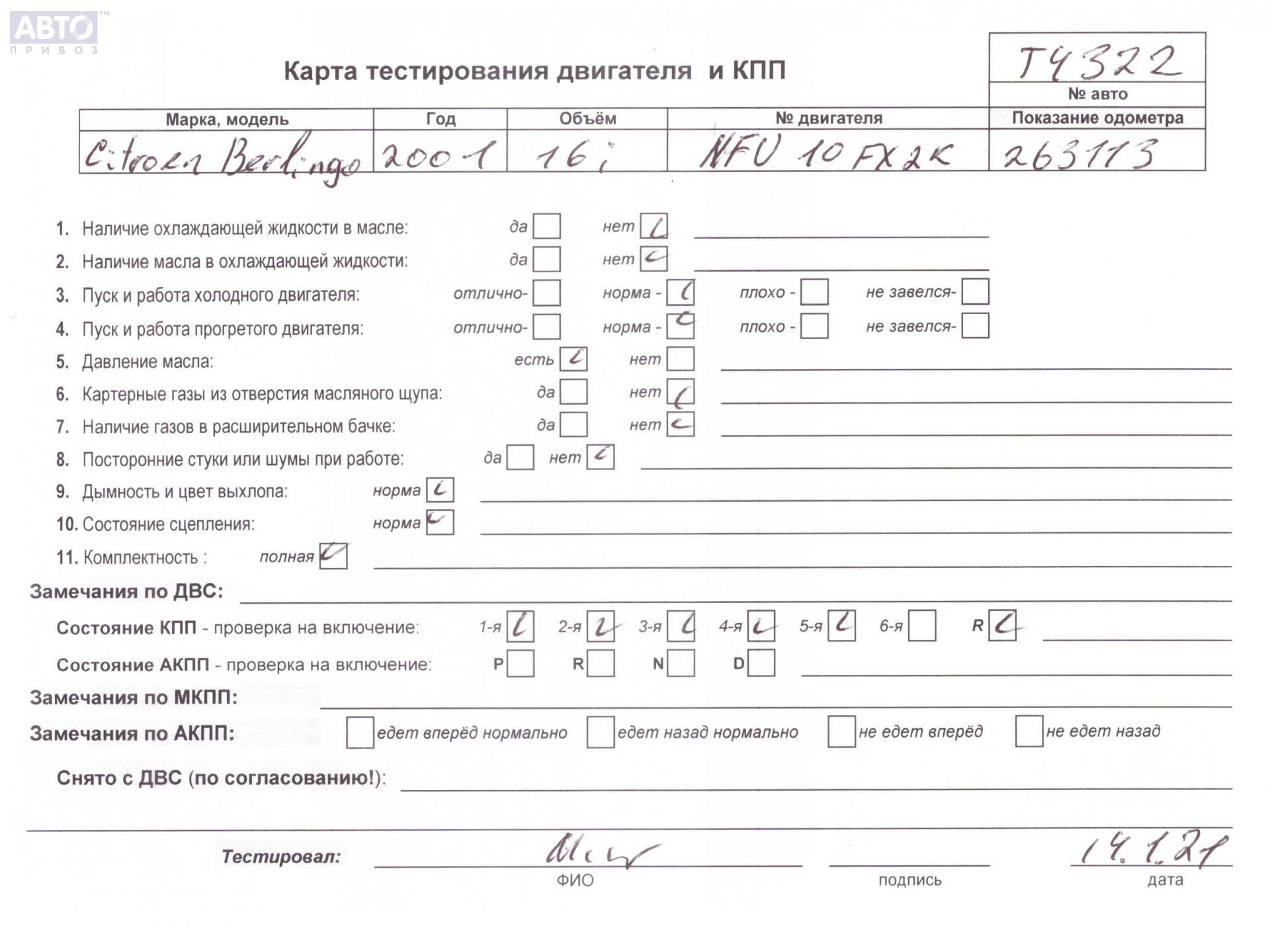 | Марка / Модель / Год: | Citroen Berlingo (1996-2002) 2001 |