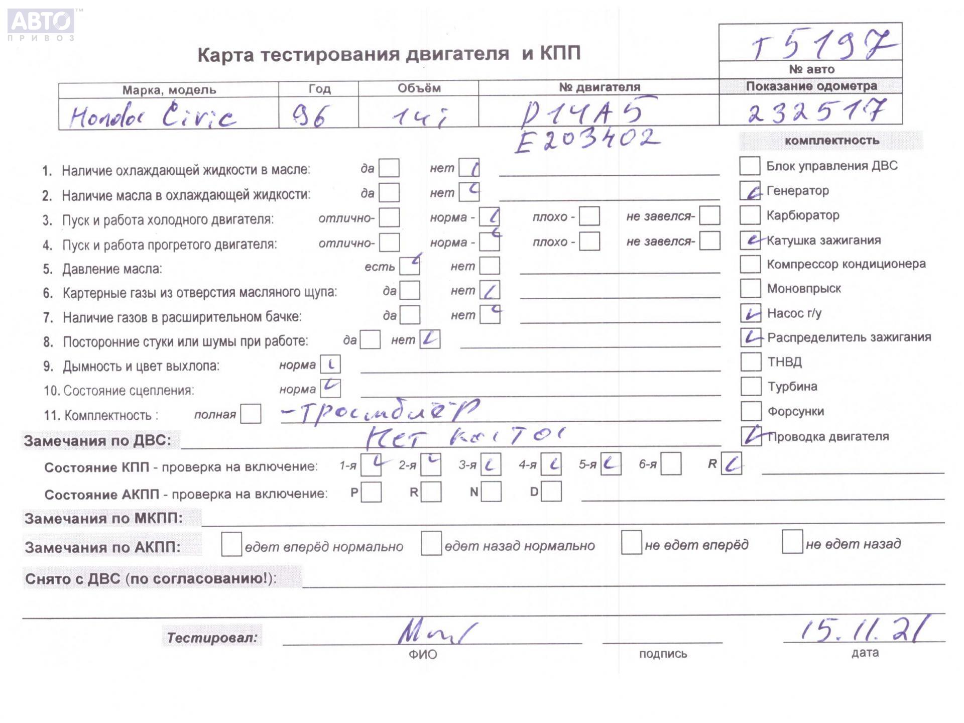 | Марка / Модель / Год: | Honda Civic (1995-2000) 1996 |