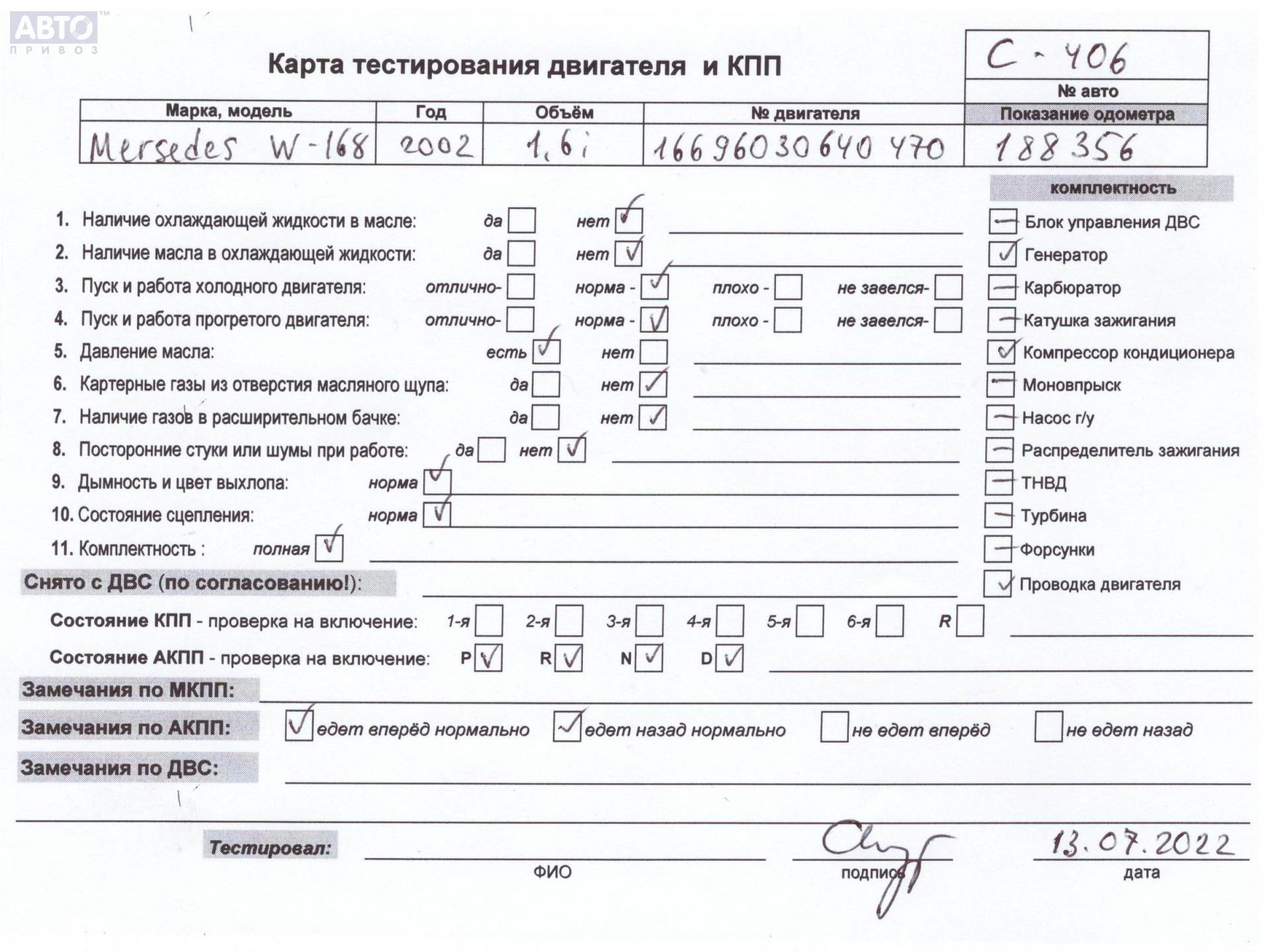| Марка / Модель / Год: | Mercedes A-Class W168 (1997-2004) 2002 |