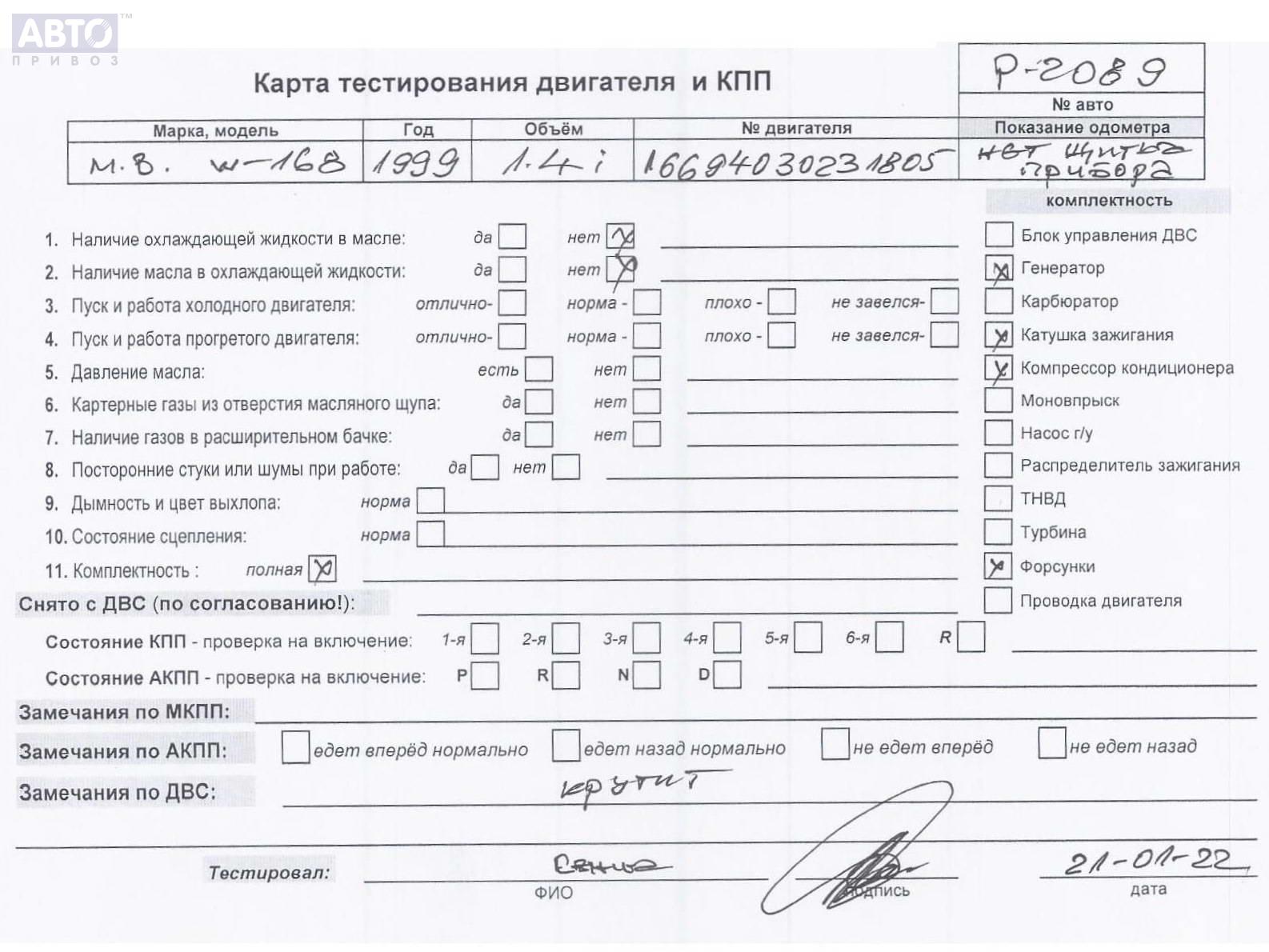 | Автомобиль / VIN: | P2089 WDB1680311J269750 |