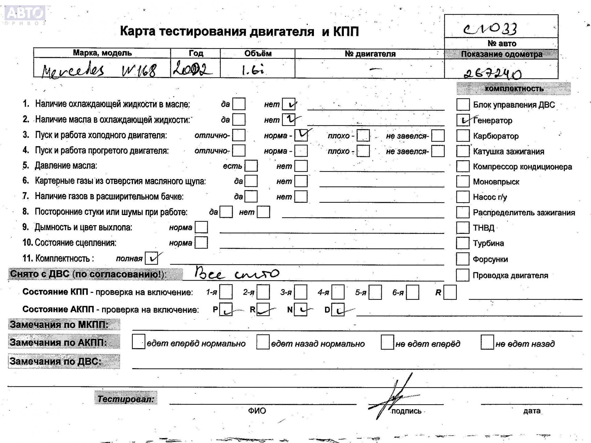 | Марка / Модель / Год: | Mercedes A-Class W168 (1997-2004) 2002 |