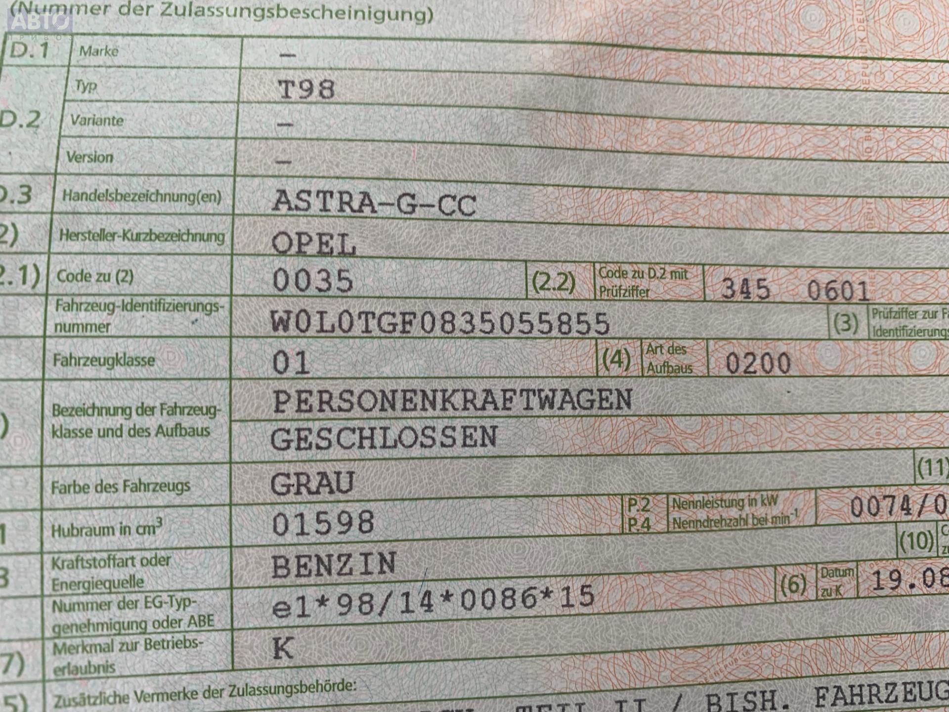 | Марка / Модель / Год: | Opel Astra G (1998-2004) 2002 |