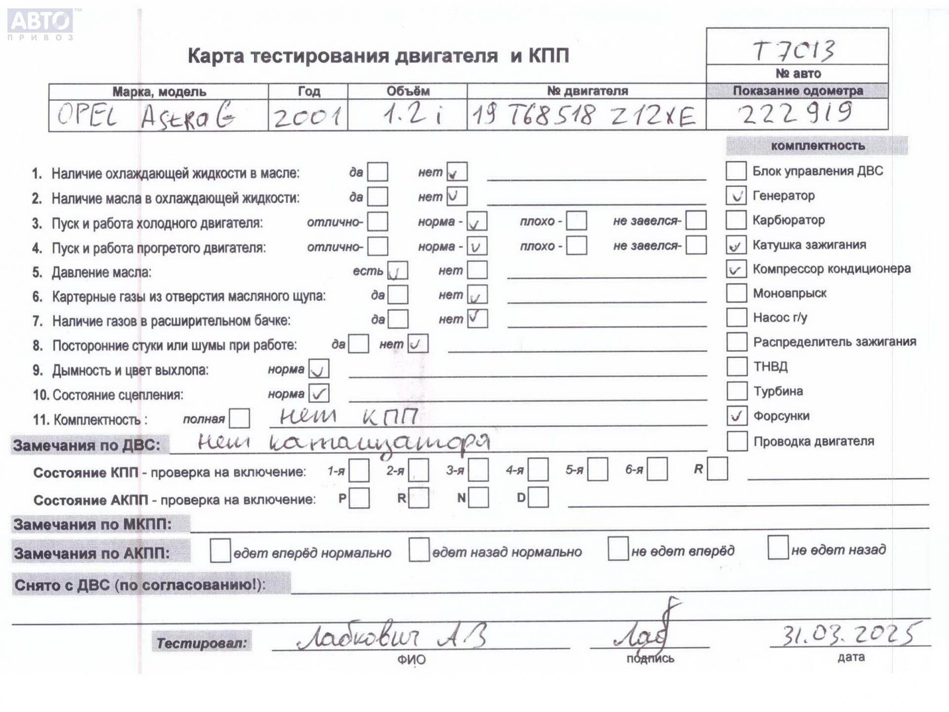 | Марка / Модель / Год: | Opel Astra G (1998-2004) 2001 |
