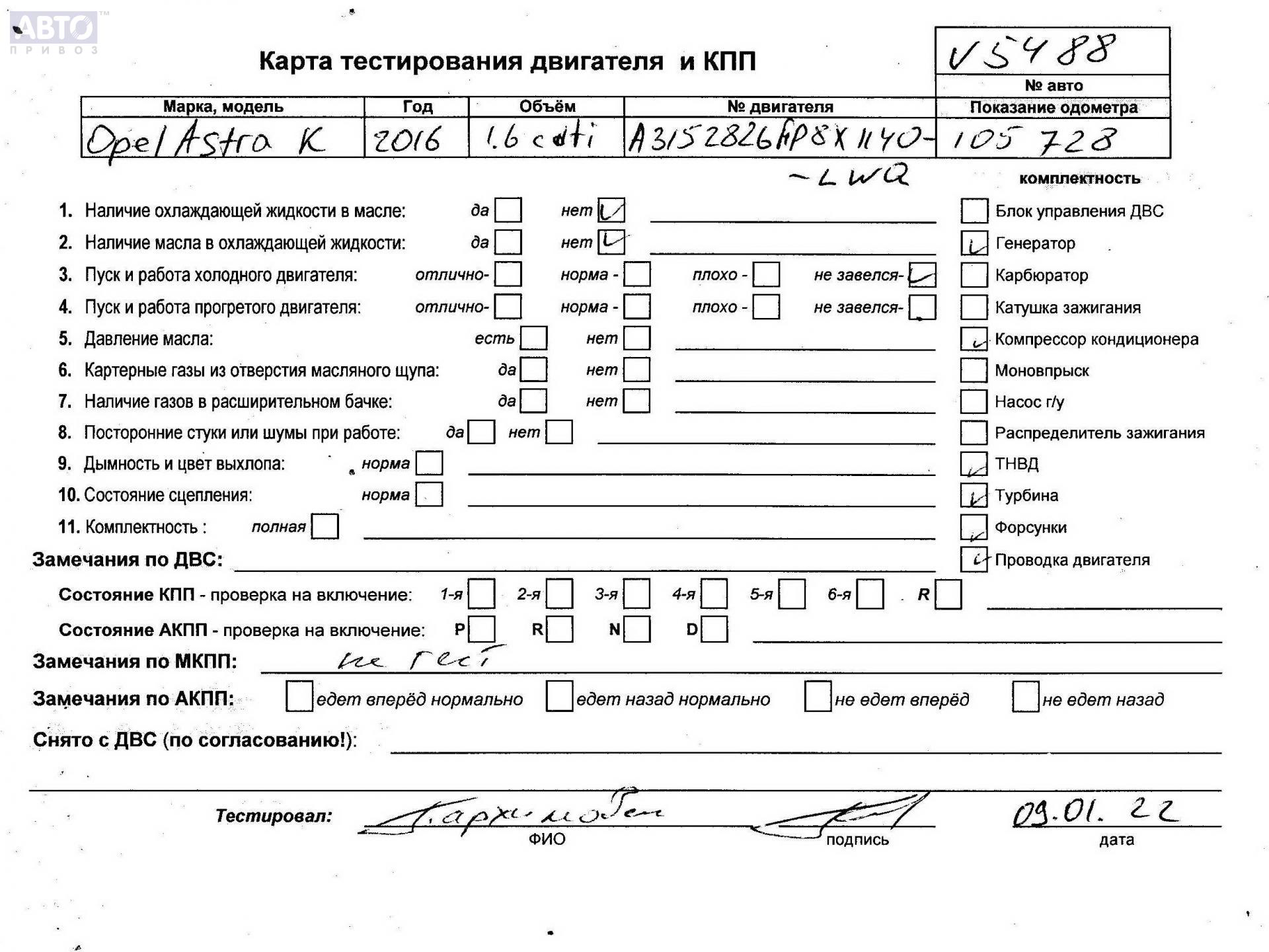 | Марка / Модель / Год: | Opel Astra K (2015-2021) 2016 |