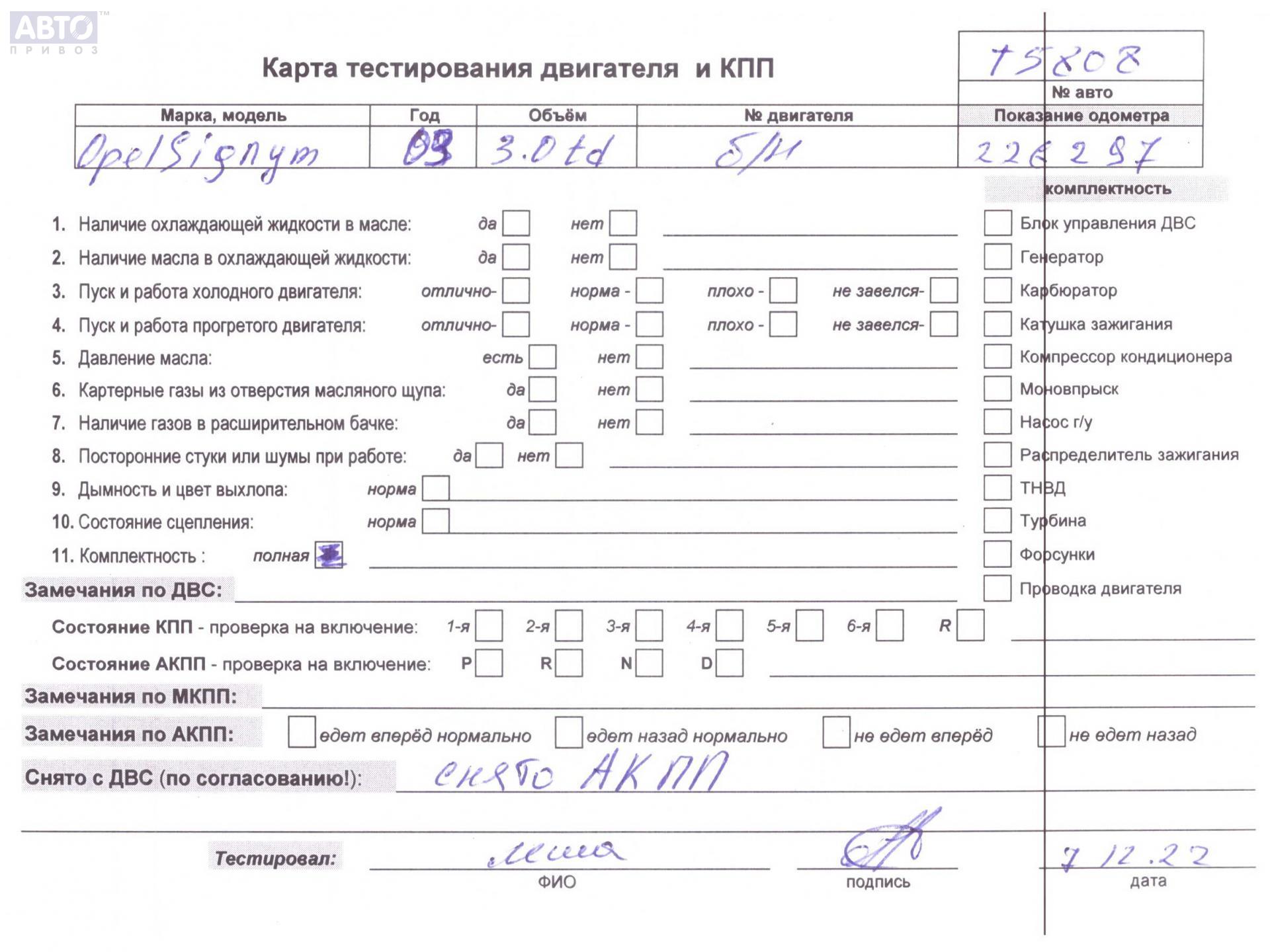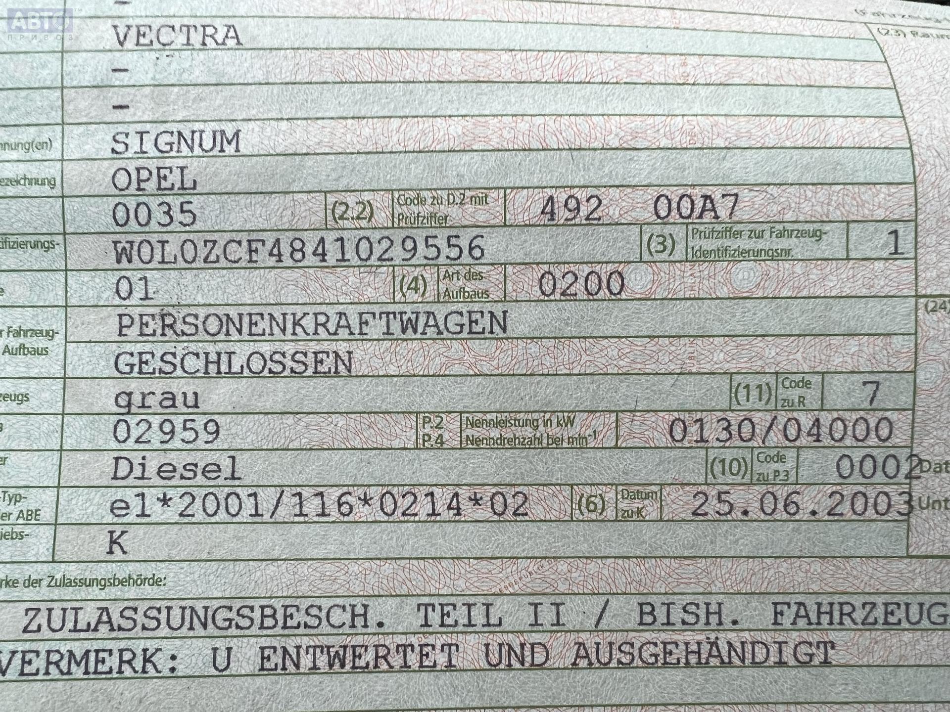 | Марка / Модель / Год: | Opel Signum (2003-2008) 2003 |