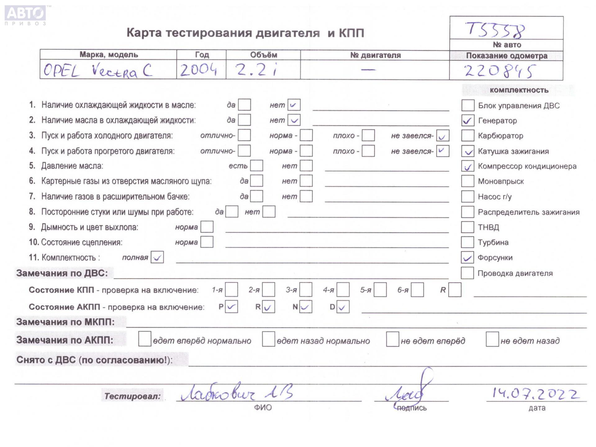 | Марка / Модель / Год: | Opel Vectra C (2002-2008) 2004 |