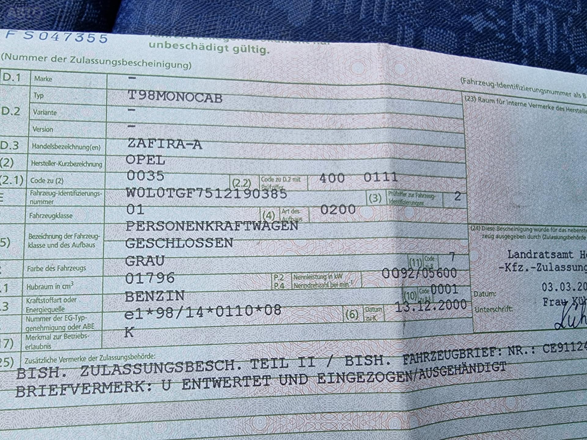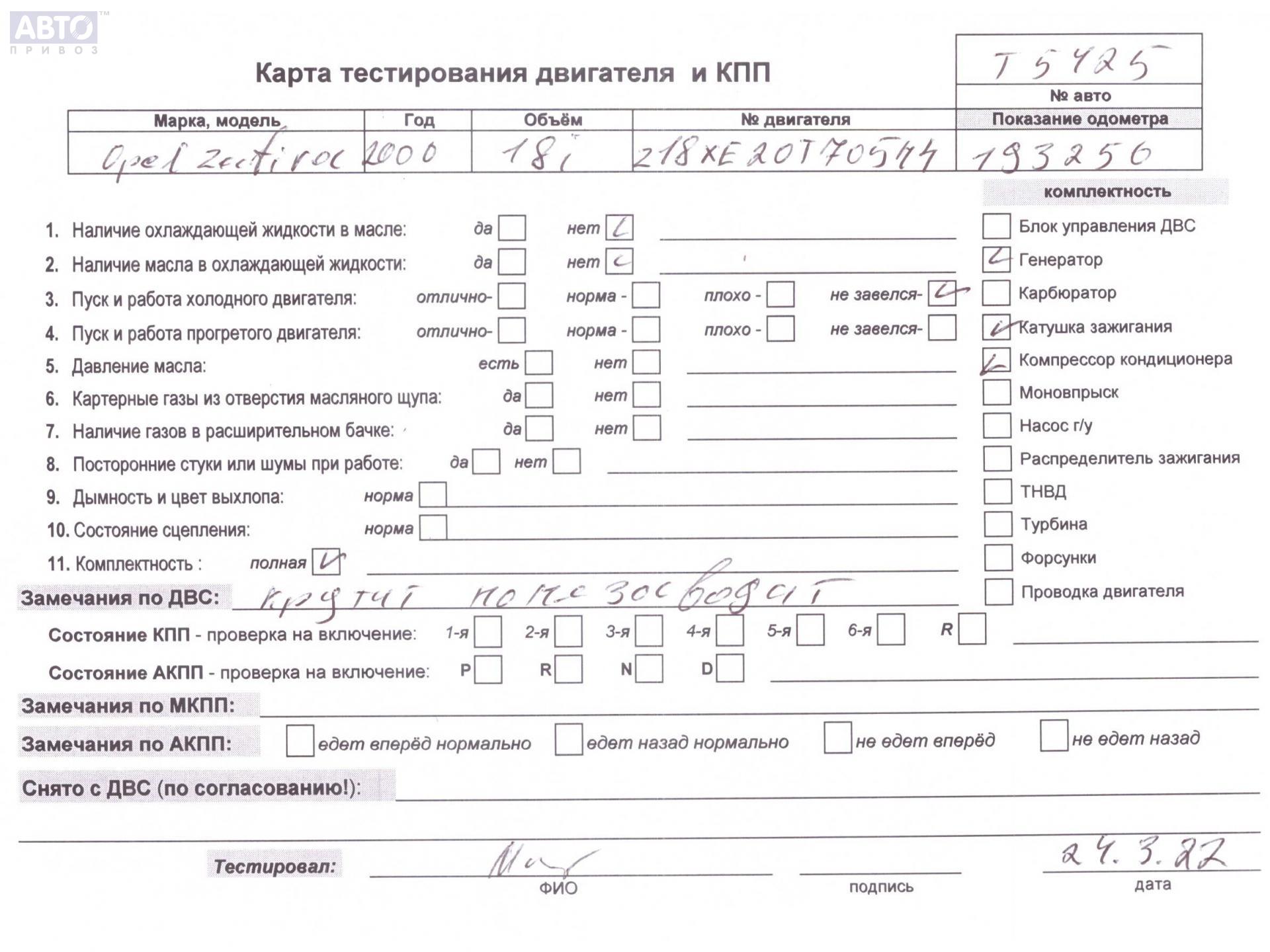 | Марка / Модель / Год: | Opel Zafira A (1999-2005) 2001 |