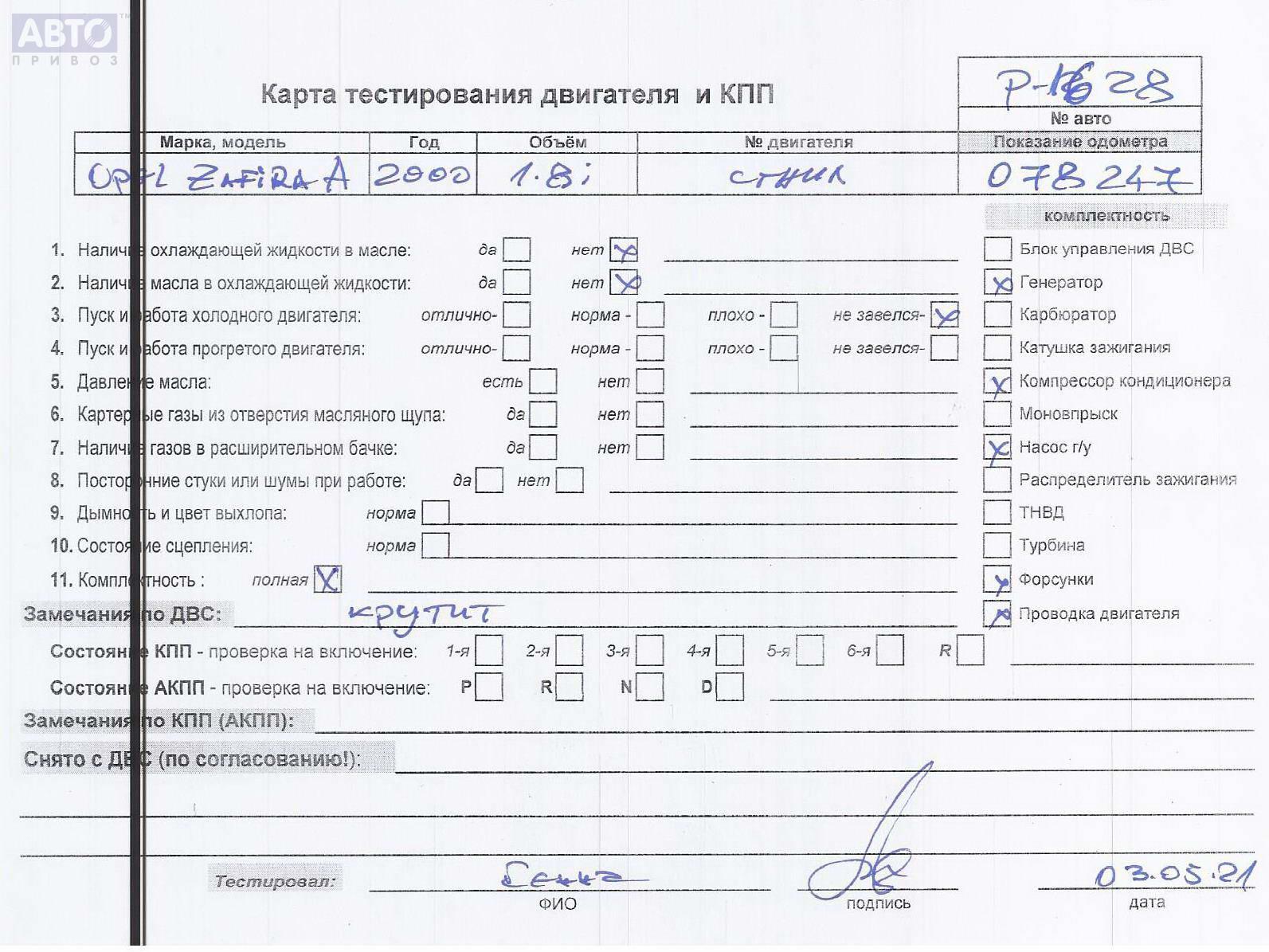 | Марка / Модель / Год: | Opel Zafira A (1999-2005) 2000 |