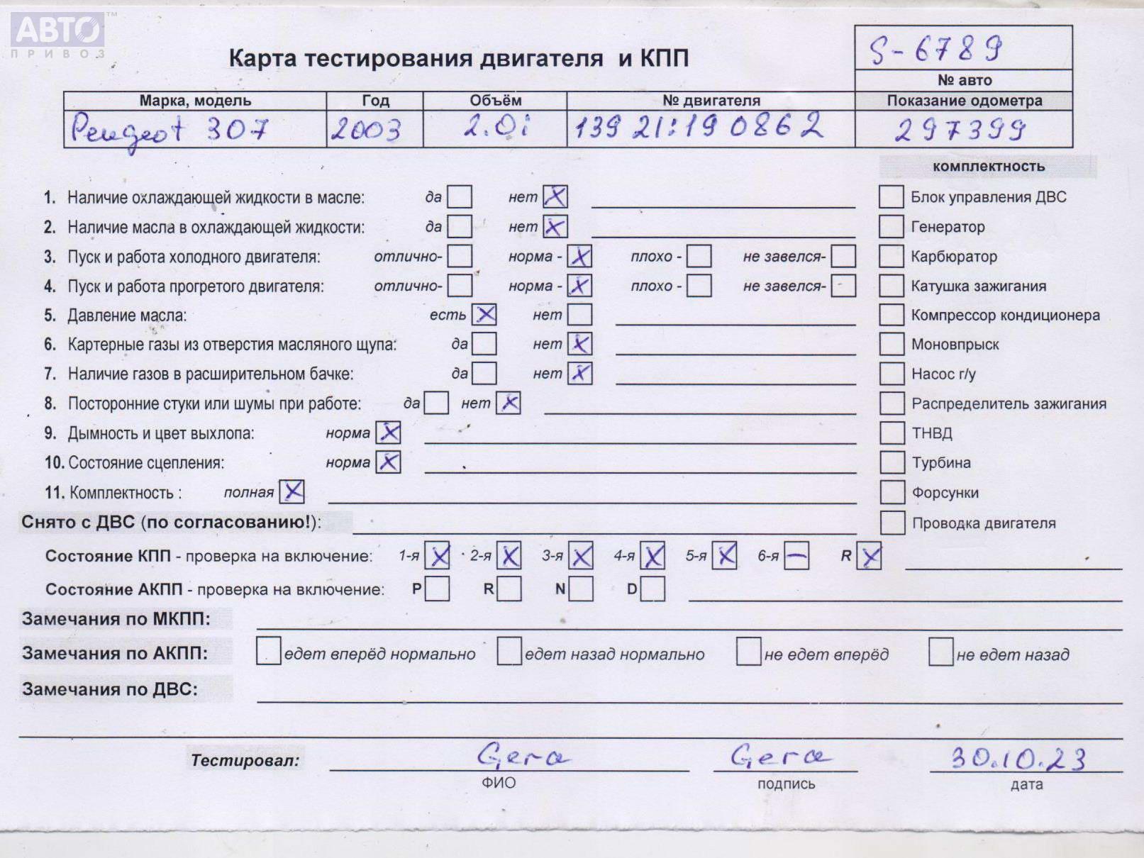 | Марка / Модель / Год: | Peugeot 307 2003 |