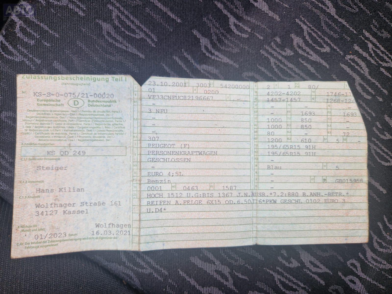 | Марка / Модель / Год: | Peugeot 307 2001 |