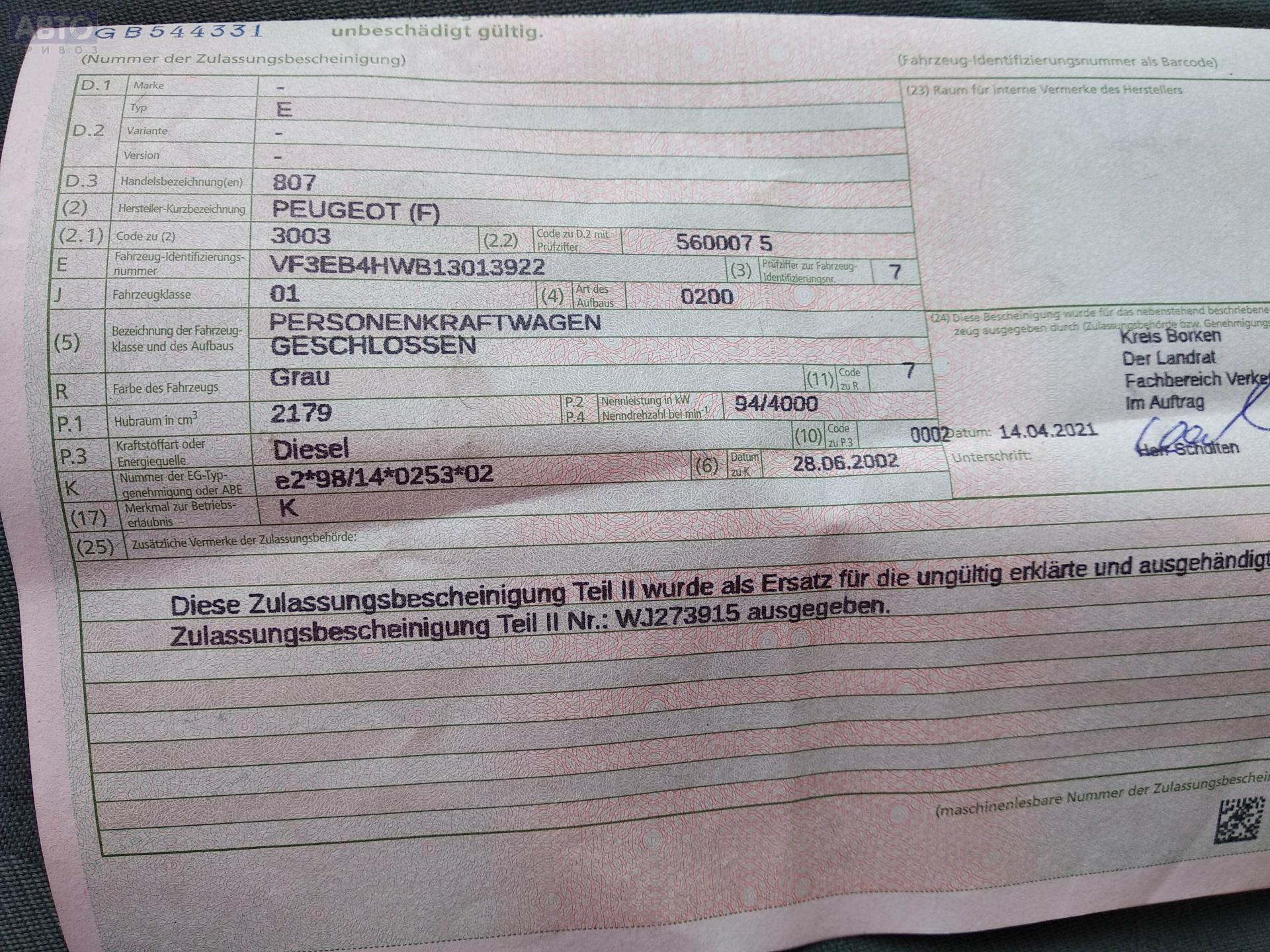 | Марка / Модель / Год: | Peugeot 807 2002 |