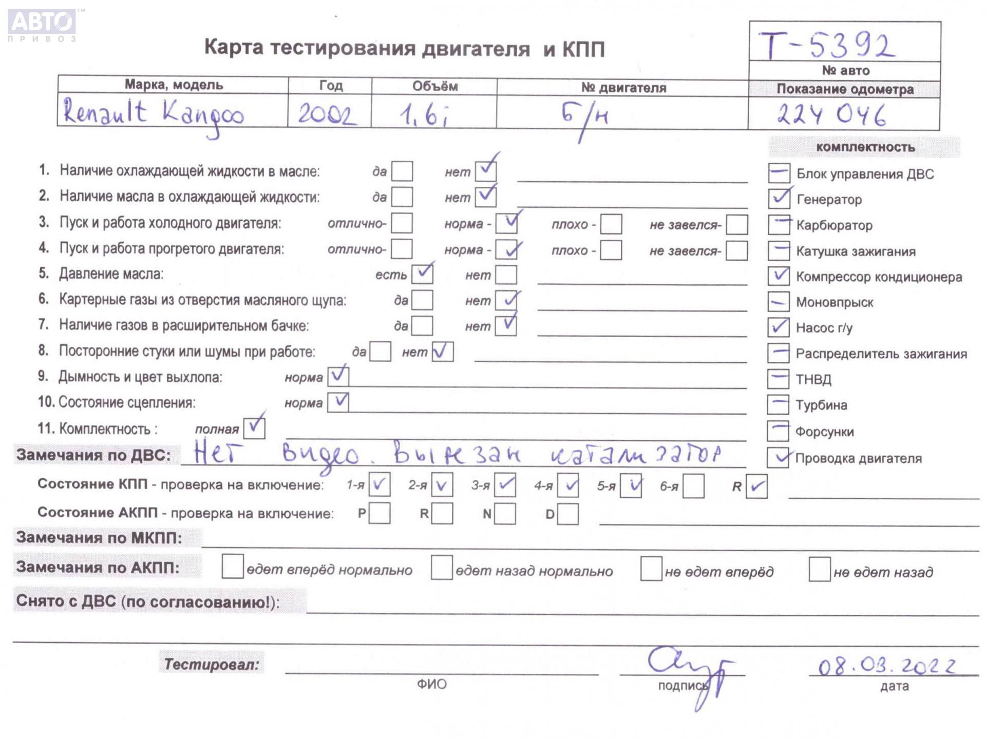 | Марка / Модель / Год: | Renault Kangoo I (1998-2008) 2002 |