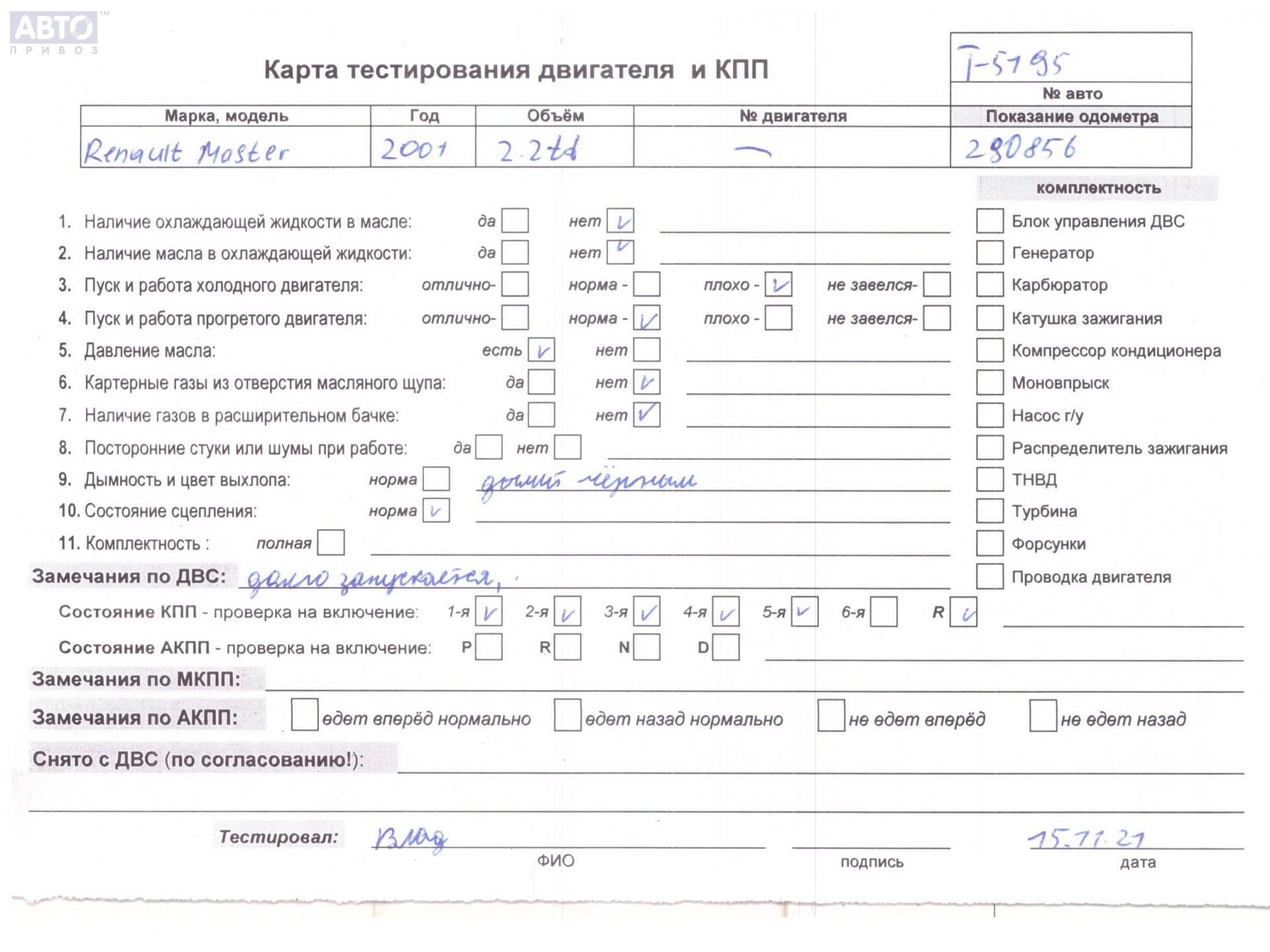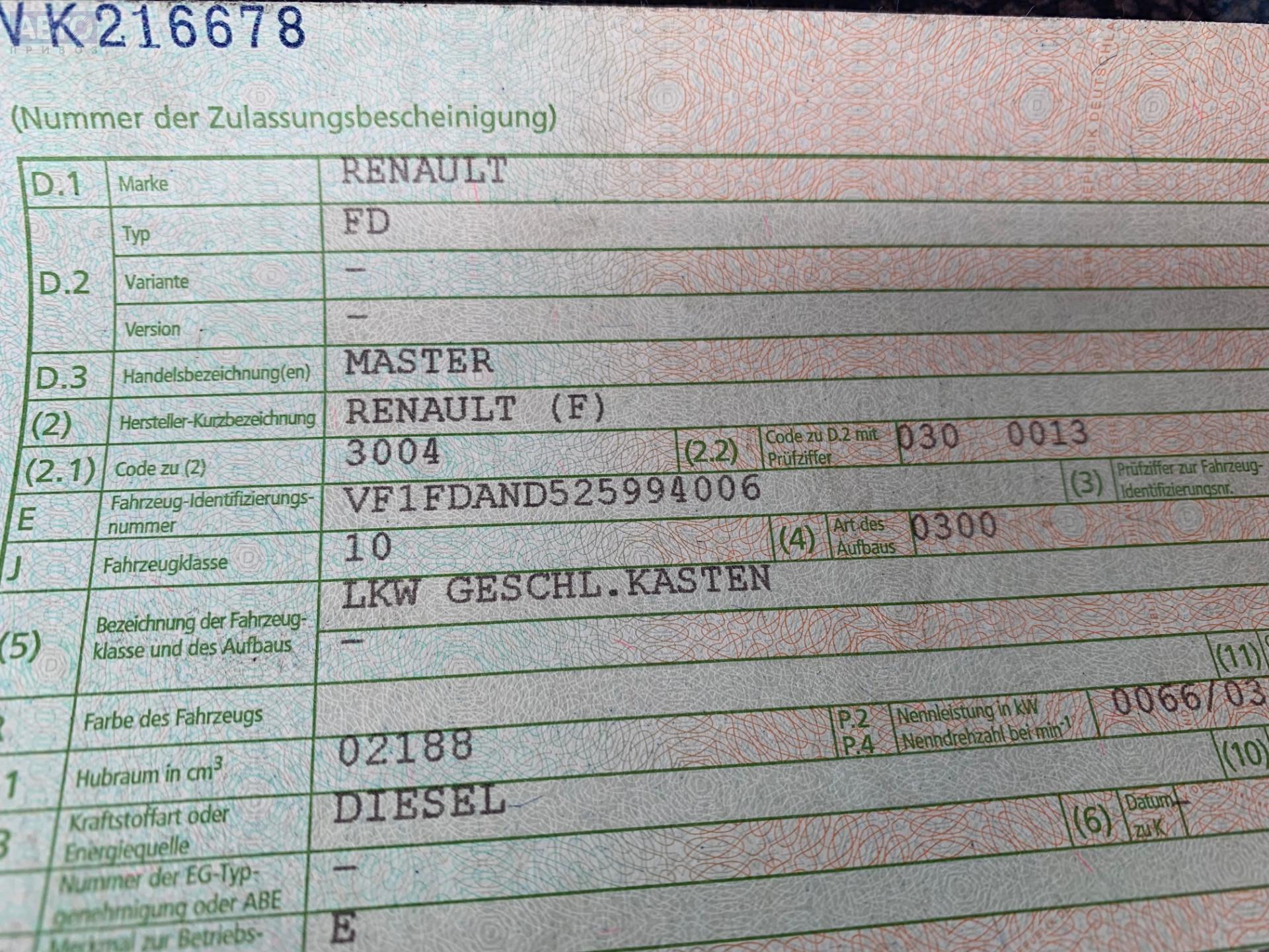 | Марка / Модель / Год: | Renault Master (1998-2010) 2002 |
