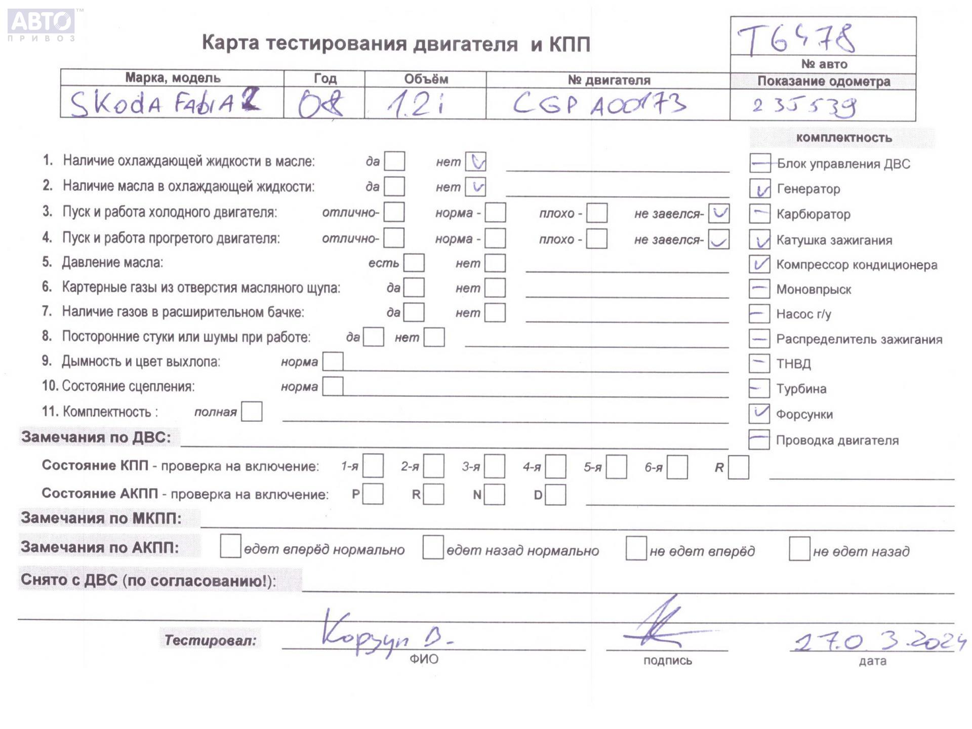 | Автомобиль / VIN: | T6478 TMBBH65J4A3092543 |