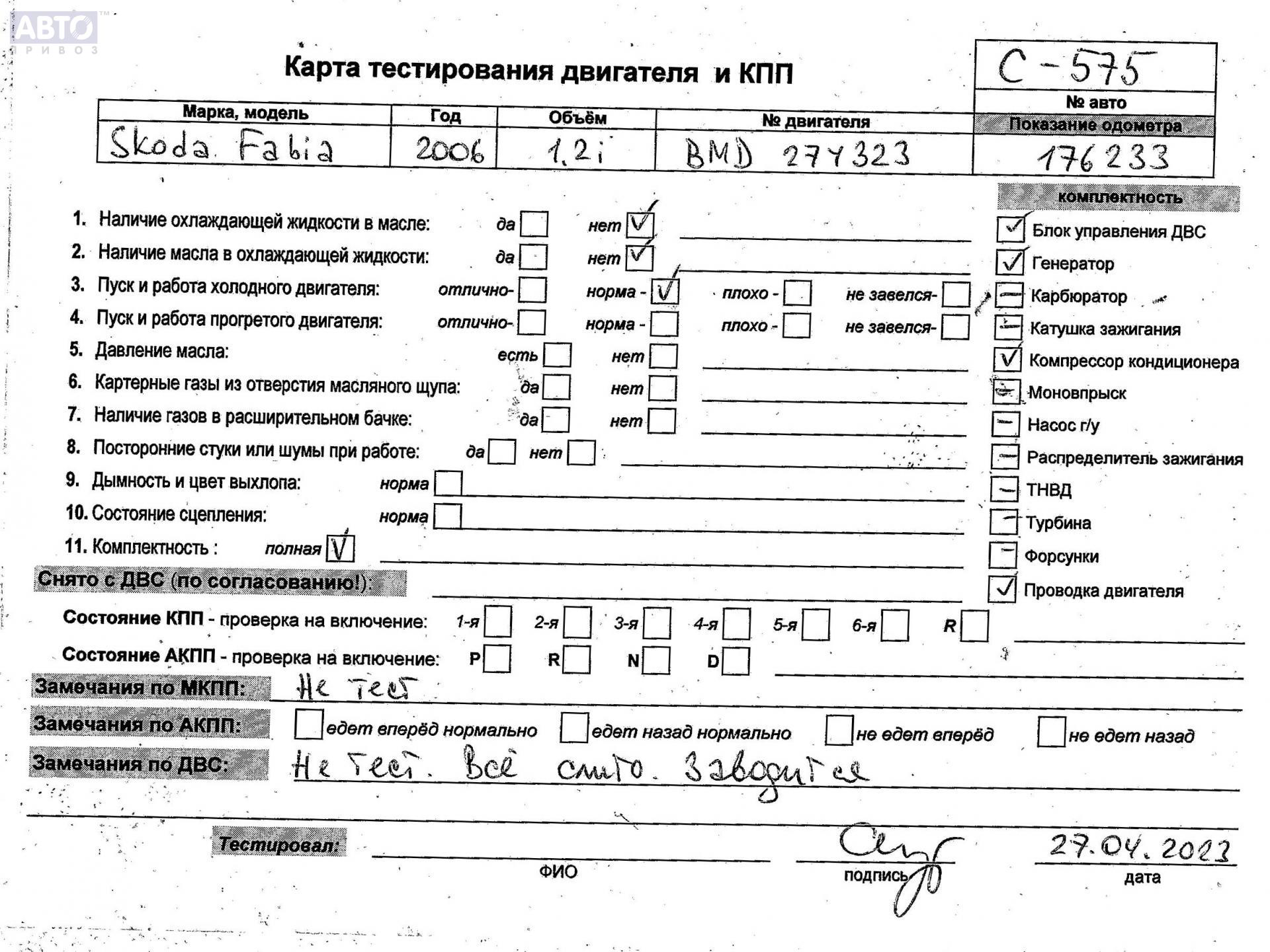 | Марка / Модель / Год: | Skoda Fabia mk1 (6Y) 2006 |