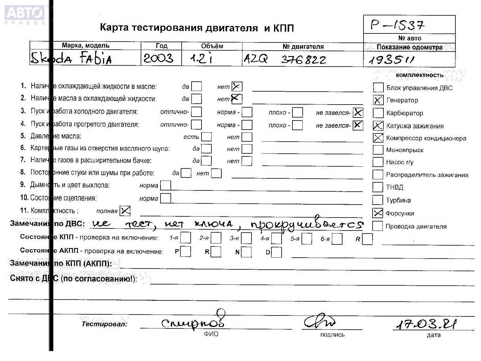 | Автомобиль / VIN: | P1537 TMBNY26YX33819835 |