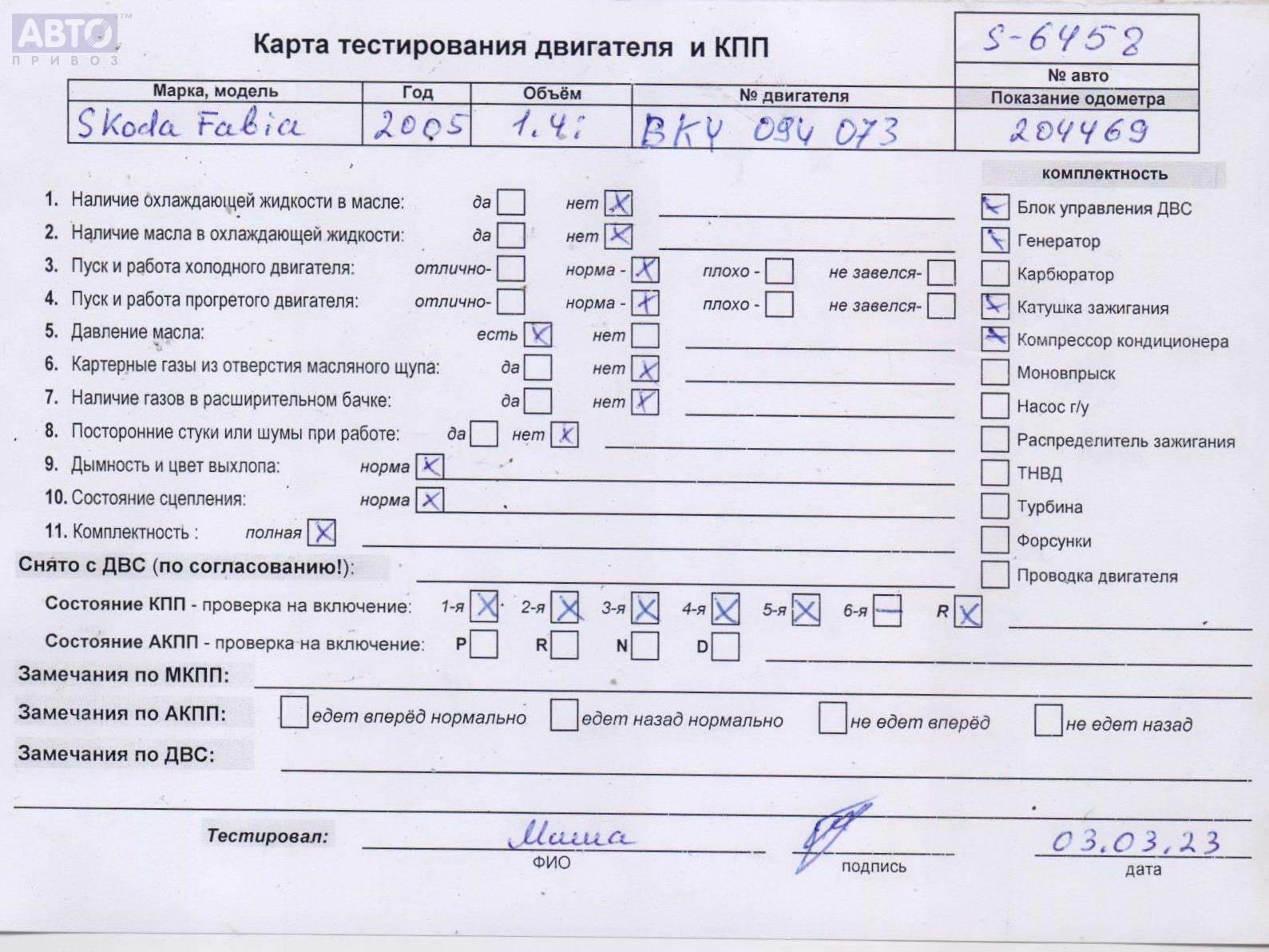 | Марка / Модель / Год: | Skoda Fabia mk1 (6Y) 2005 |