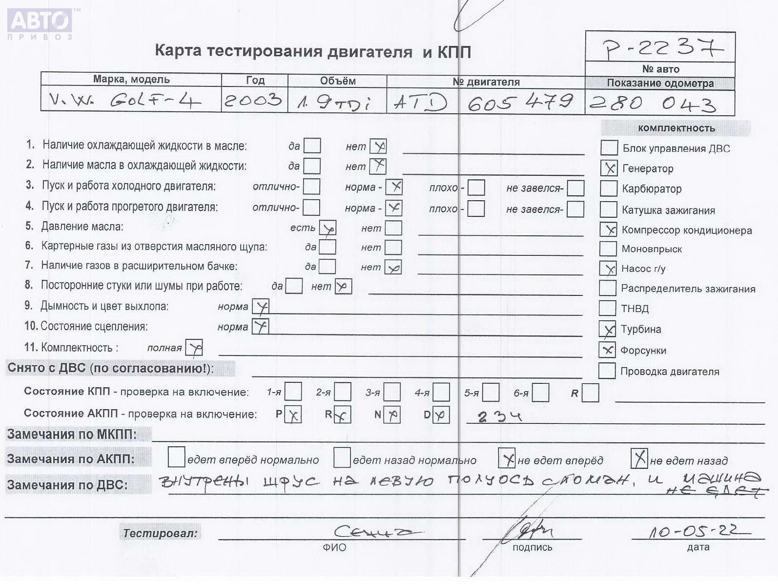 | Автомобиль / VIN: | P2237 WVWZZZ1JZ4W106472 |