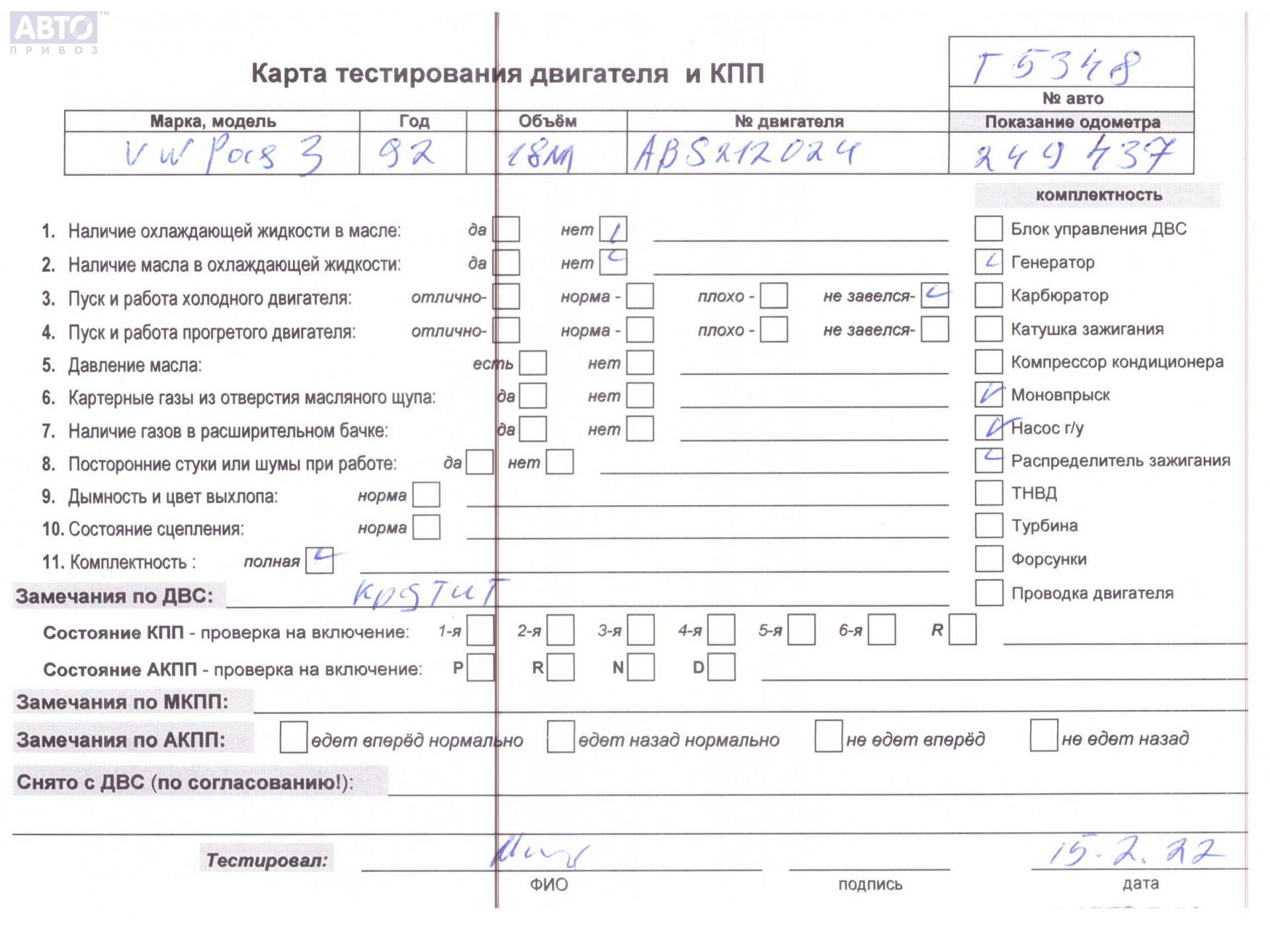 | Автомобиль / VIN: | T5348 WVWZZZ31ZNB252309 |