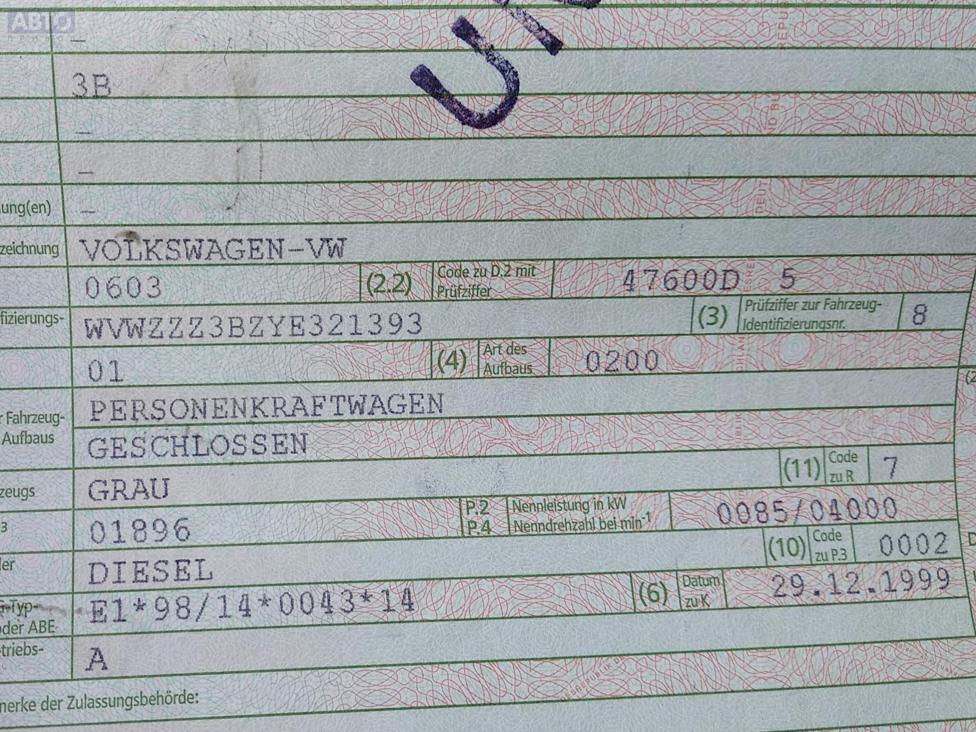 | Марка / Модель / Год: | Volkswagen Passat B5 1999 |