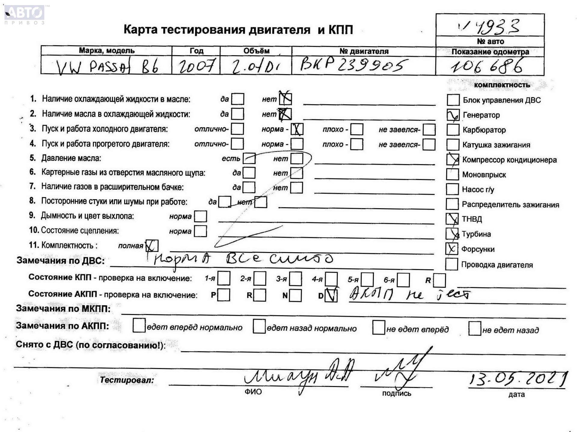 | Марка / Модель / Год: | Volkswagen Passat B6 2007 |
