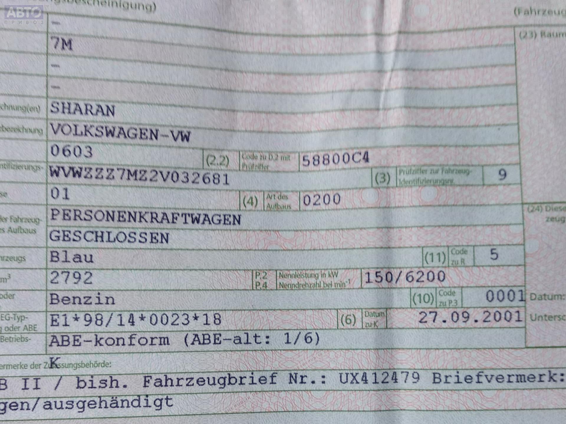 | Марка / Модель / Год: | Volkswagen Sharan (2000-2010) 2001 |