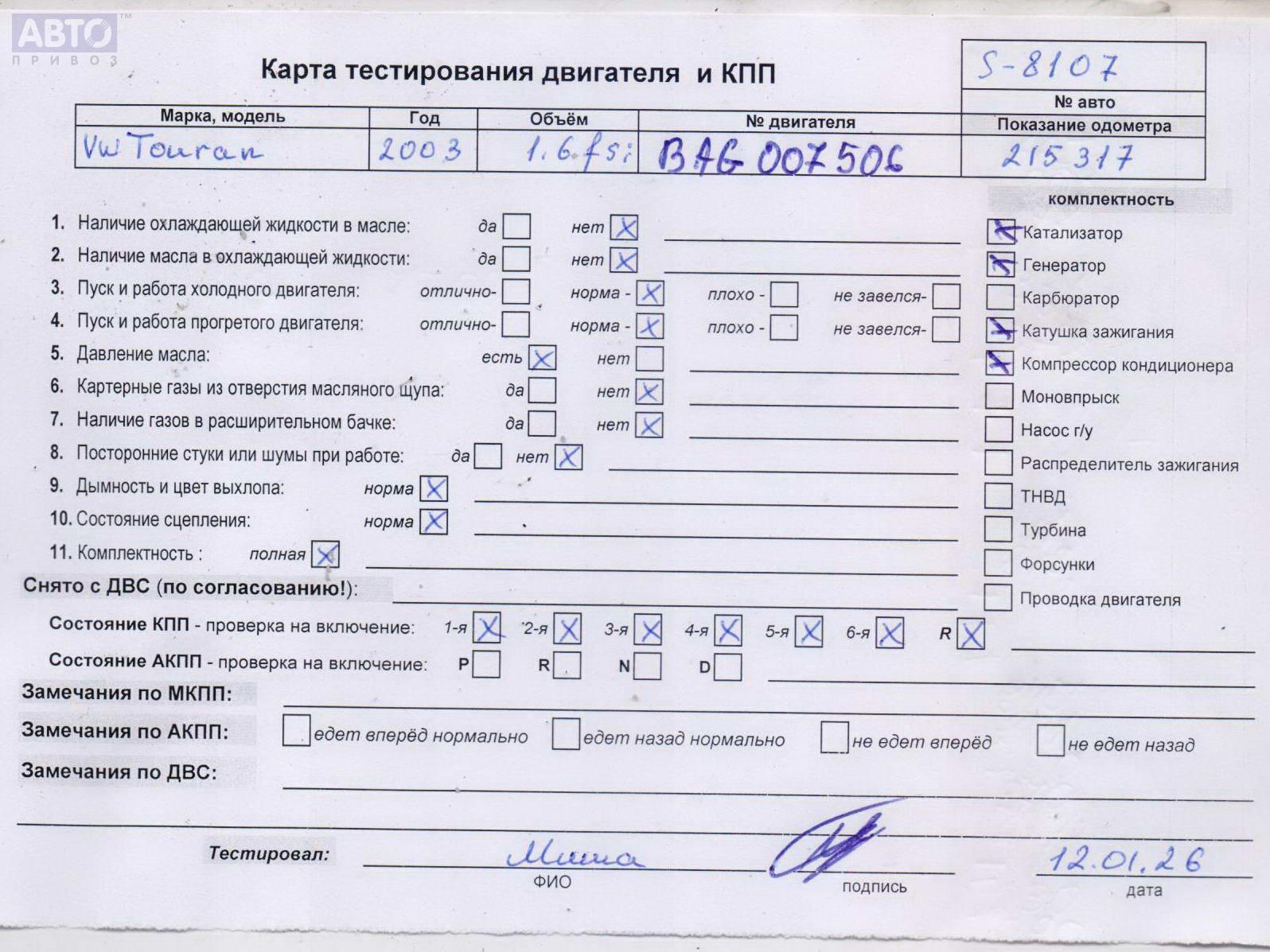 | Марка / Модель / Год: | Volkswagen Touran 2003 |