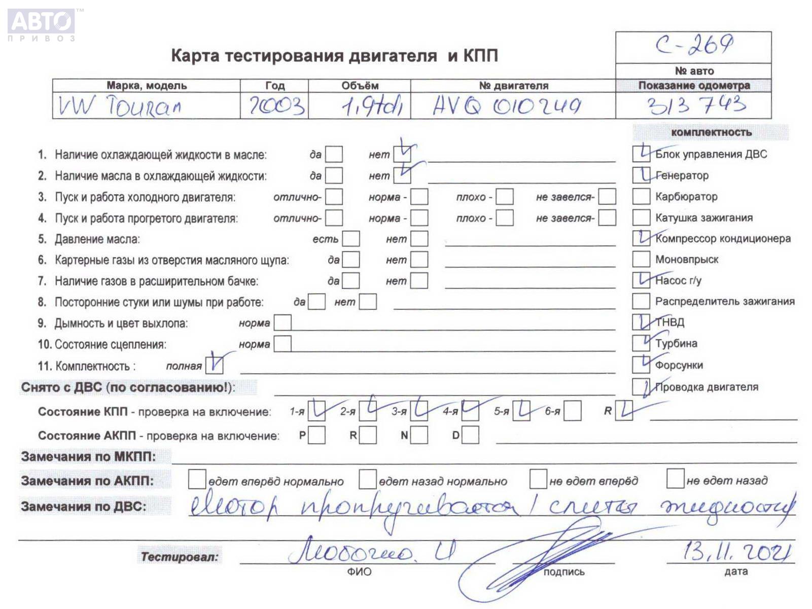 | Марка / Модель / Год: | Volkswagen Touran 2003 |