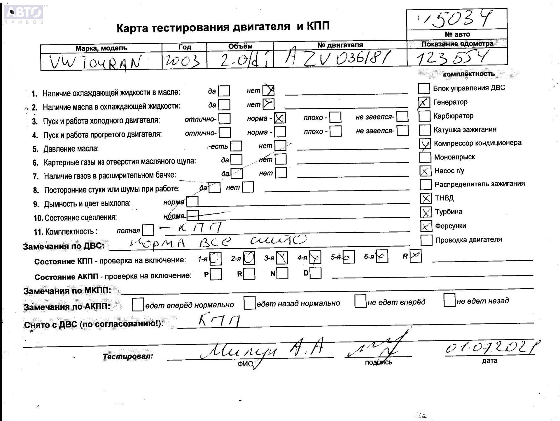 | Марка / Модель / Год: | Volkswagen Touran 2003 |