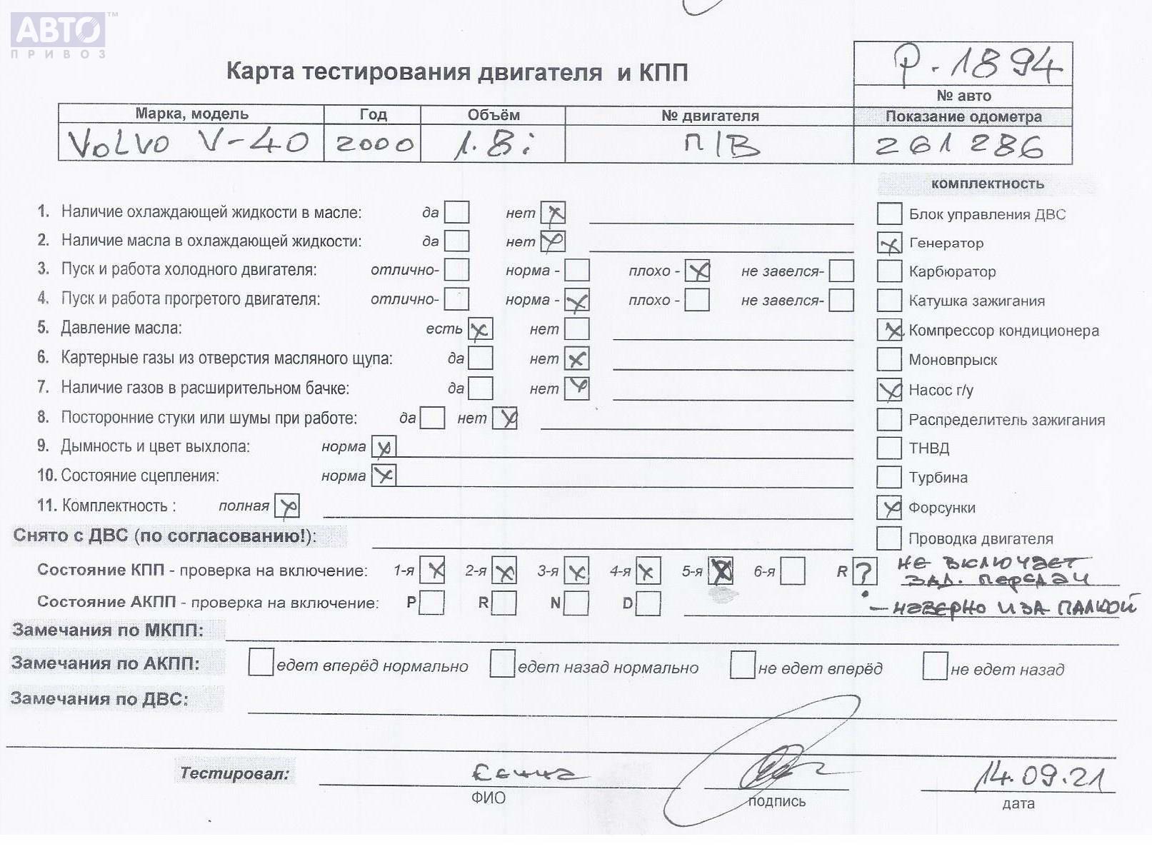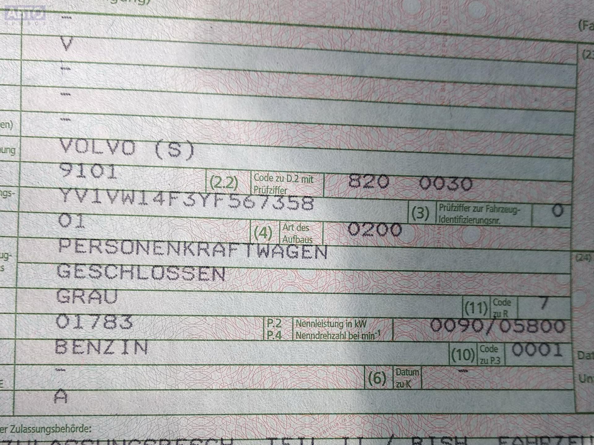 | Автомобиль / VIN: | P1894 YV1VW14F3YF567358 |