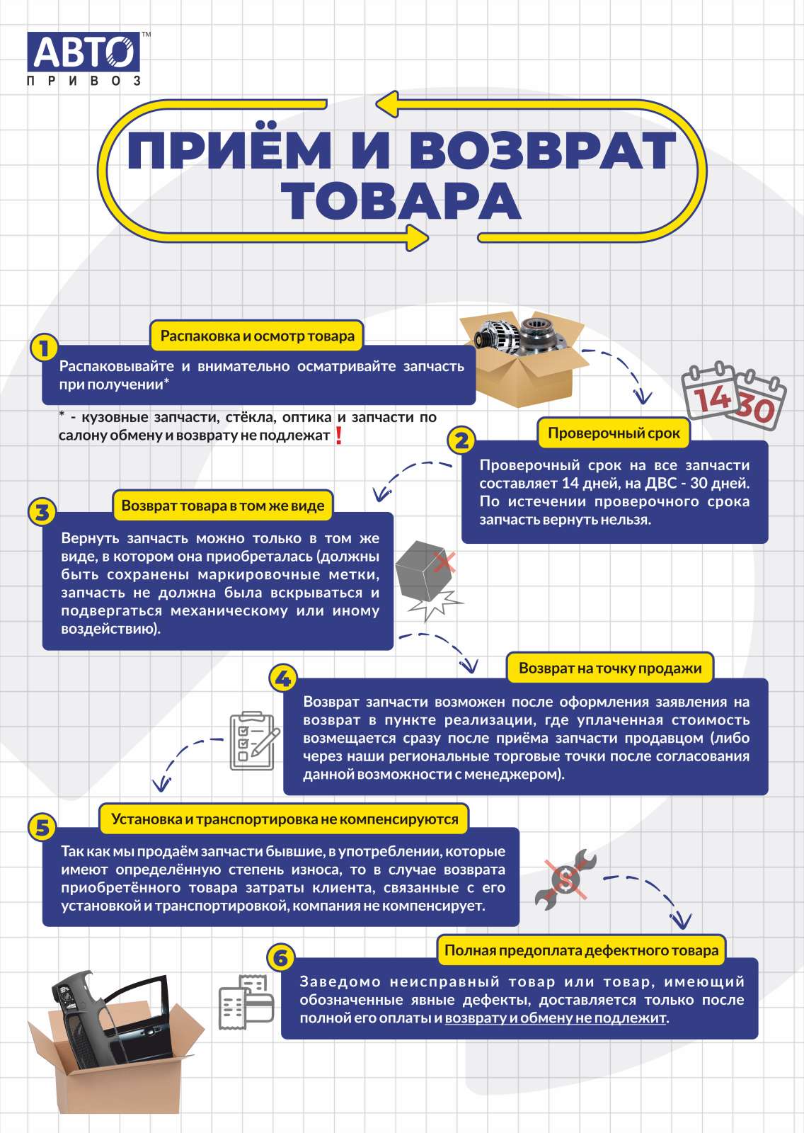 Приобретённый в нашей компании товар покупатель имеет право вернуть в течение 14 календарных дней с момента совершения (получения) покупки, при условии, что товар (автозапчасть) не был использован (не установлен на автомобиль), не подвергался механическому или иному воздействию и остался в неизменном с момента продажи виде, а также имеются доказательства приобретения его в нашей компании (чек / товарный чек либо бирка с артикулом нашей запчасти).