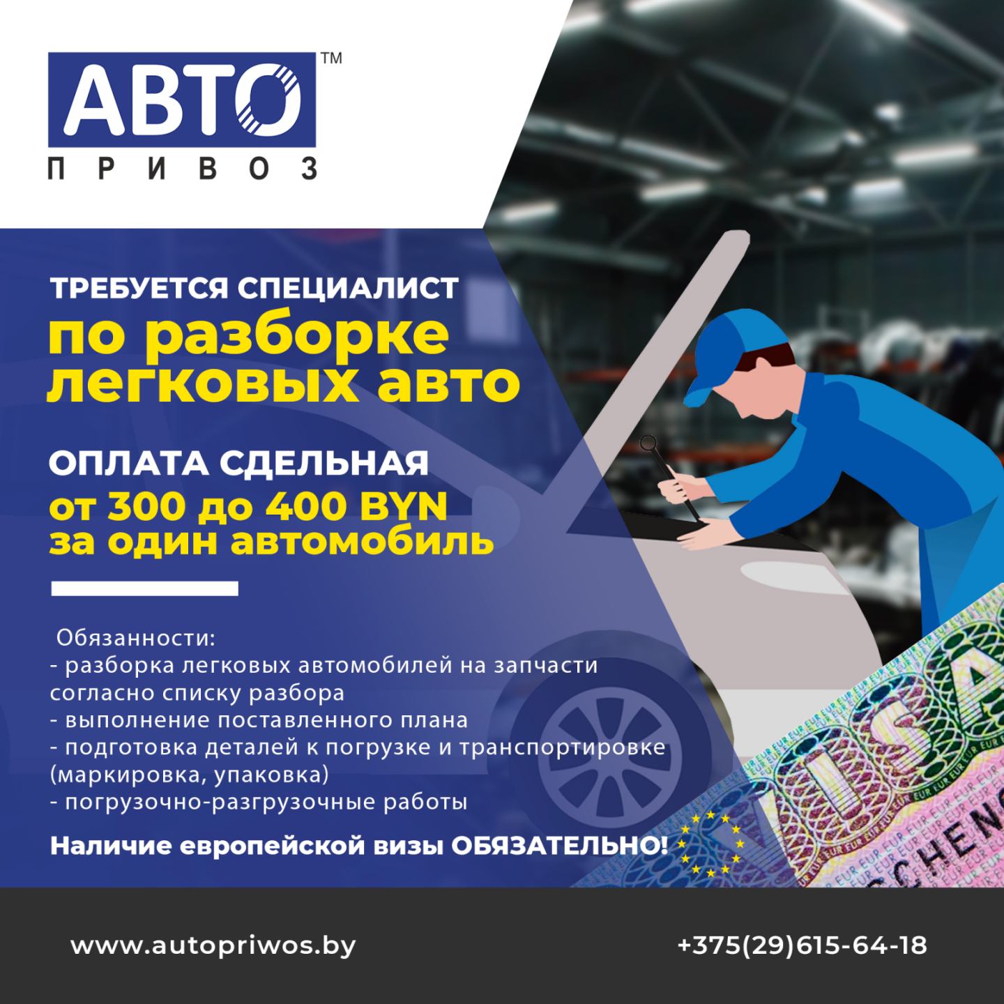 Оплата сдельная (зависит от количества разобранных авто, из расчета от 300 до 400 BYN за машину).